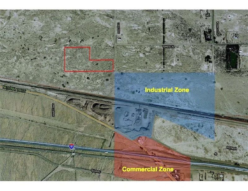 1/2 mile N. of Fwy 40 (an interstate freeway), level lot with 330’ of frontage on Malibu Rd. and 660’ of frontage on Temescal Rd. 1/4 mile N. of National Trails Hwy (Route 66) 1.5 miles driving distance to Fwy 40 access (Newberry Rd.) Utilities on Malibu with ground water The information provided herein is deemed accurate, but buyer and agent to do own due diligence. There are no warranties, express or implied.