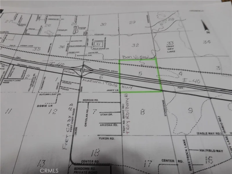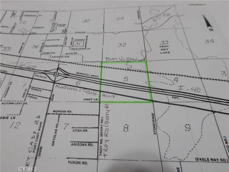 577.61 acres in Newberry Springs. It consists of 4 parcels, stacked on top of each other, that make up an entire Section of land minus the easements for US Hwy 66/National Trails Hwy, I-40, Memorial Drive & the railroad easements. All 4 of these parcels are 1 mile long from east to west. The most southerly parcel, APN 0529-151-09, is 27.26 acres. The north line of this parcel has frontage on the south side of US Hwy 66. It begins at Berry Rd (AKA Troy RD) and continues east 1 mile to Stonehenge Rd. The next parcel going north, APN 0529-151-08, is 129.51 acres. It also begins at Berry Rd (AKA Troy RD) and continues east 1 mile to Stonehenge Rd. It's the land between National Trails Hwy and Eastbound I-40. The next parcel going north, APN 0529-151-07, is 46.31 acres. It's the parcel between Westbound I-40 and Memorial Drive and is also 1 mile from east to west. And last but not least, the 4th parcel going north, APN 0529-151-06 is 373.53 acres. It has frontage on the north side of Memorial Drive and goes all the way north past the railroad to Bon View Ave. The NW corner of this parcel is at the SW corner Bonview Ave & Troy Rd. All 4 parcels together total 577.61 acres, allowing plenty of space & so many options. Solar farm, housing development, crops, livestock or all of the above could be achieved. Crops such as Pistachios, Apricots, Avocado, Peppers, Pomegranate & other crops do well in this area. Buyer to verify zoning & availability of electricity. Residents in the area use private wells, septic systems & propane as there are currently no public services for water, sewer or gas. Electric should be available all along US Hwy 66/National Trails Hwy. DIRECTIONS: From Barstow, take I-40 towards Needles. Take the Fort Cady Rd. Exit, get on US Hwy 66, continue east 1 mile to Troy Rd. (AKA Berry Rd). You will be at the approximate NW corner of the of the most southern parcel. Continue another mile east on Us Hwy 66 to the approximate NE corner of the most southern parcel. To view the parcels on the north side of I-40, go back to Fort Cady Rd, turn right right & cross over I-40, turn right on Memorial Drive and go 1 mile. The property will be on your right & on your left.