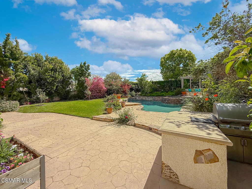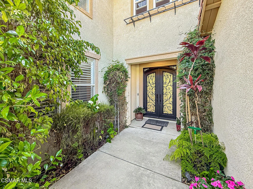ABSOLUTELY STUNNING! This highly upgraded and remodeled Dos Vientos beauty is gorgeous inside and out, including the picturesque entertainer's backyard with pool. This home's highly SOUGHT AFTER open floor plan offers 4 bedroom /room options plus a room downstairs that could be used as an office, or possible 5th bedroom. There is an additional large loft room upstairs. Upon entering the home you are welcomed by a botanical front porch with dark majestic metal double doors displaying an intricate design with privacy glass which can open separately to receive a fresh cross breeze. First steps inside this home presents a grand BRIGHT, OPEN, LAYOUT, high ceilings in entry, plantation shutters and gorgeous rich tile wood flooring throughout most of the downstairs. The spacious living room and dining room boast several tall windows with beautiful Shutters that frame parts of these rooms which overlook the beautifully bloomed backyard. The huge redesigned cooks kitchen is outstanding!! All cabinetry is custom built with high quality materials, including the paint, Quartz countertops, backsplash and soft close drawers. There are two tall cabinet pantries with pull out drawers, a 6 burner WOLF range, and stainless steel appliances. The LARGE central island with a long breakfast bar is a focal point and is ideal for entertaining!. The kitchen opens to the bright, roomy family room which displays a fireplace, upgraded Pella windows which include integral blinds between the glass panels, a sliding french door with slider screen door. The breathtaking entertainer's backyard features a large grassy area surrounded by blossoming Bouganvilla, a saltwater pool, built-in firepit with seating, built- in BBQ, expansive patio with plenty of room for lounge chairs, seating areas, and entertaining. Like to garden? You will find numerous fruit trees (peach, lemon, grape, apricot, passionfruit, apple,and cherry ). The downstairs room sits tucked away next to the guest bathroom and can be used as an office, bedroom, kids play room. etc. Heading upstairs you will notice the upgraded casement windows at the top of the stairs that used to be stationary. The open, airy upstairs hallways have beautiful wood-like flooring with all the bedrooms boasting fresh neutral light colored paint and carpeting. The spacious Primary suite overlooks the pretty backyard and the LUXURIOUS, remodeled ensuite bathroom displays custom cabinetry, dual sinks, quartz countertops and shower, and a stand alone bathtub with upgraded faucets. Wood tile flooring runs through the bathroom into the generous walk-in closet. There are 3 more bedrooms, one of which is extra large and can be used as a multipurpose room. Additionally, you will enjoy the grand loft /bonus room which can be an amazing game room or separate lounge area. There are so many room options! The second bathroom upstairs is beautiful with upgraded cabinetry, quartz countertops and shower and wood tile flooring. There is solar which is paid for and will heat the pool. The Garage is a 3 car with no tandem. This home is Amazing and is situated in an excellent location. Thee are several parks, Tennis and Pickleball courts, Hiking and biking trails, Award winning Sycamore Canyon K-8 school, and the shopping center in Dos Vientos Ranch.DO NOT MISS THIS ONE!