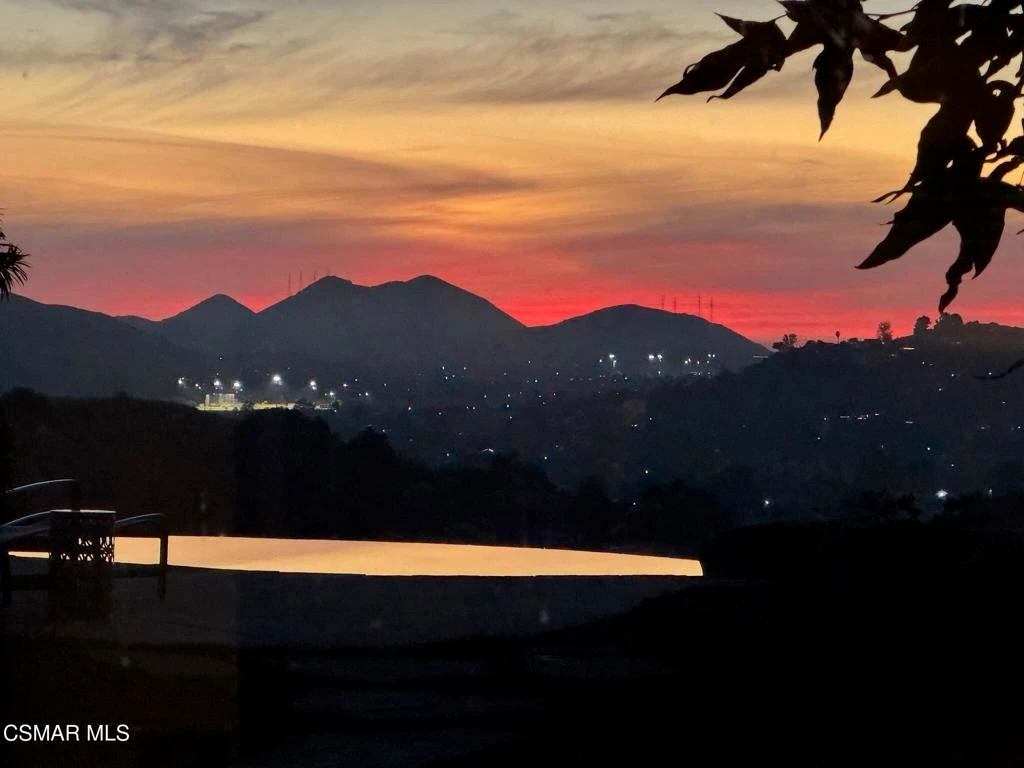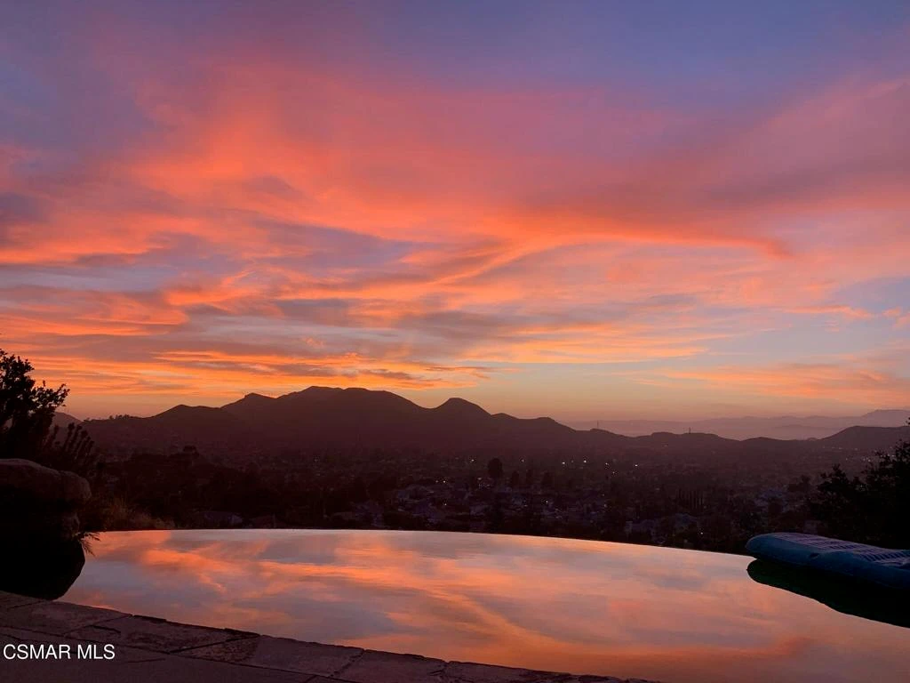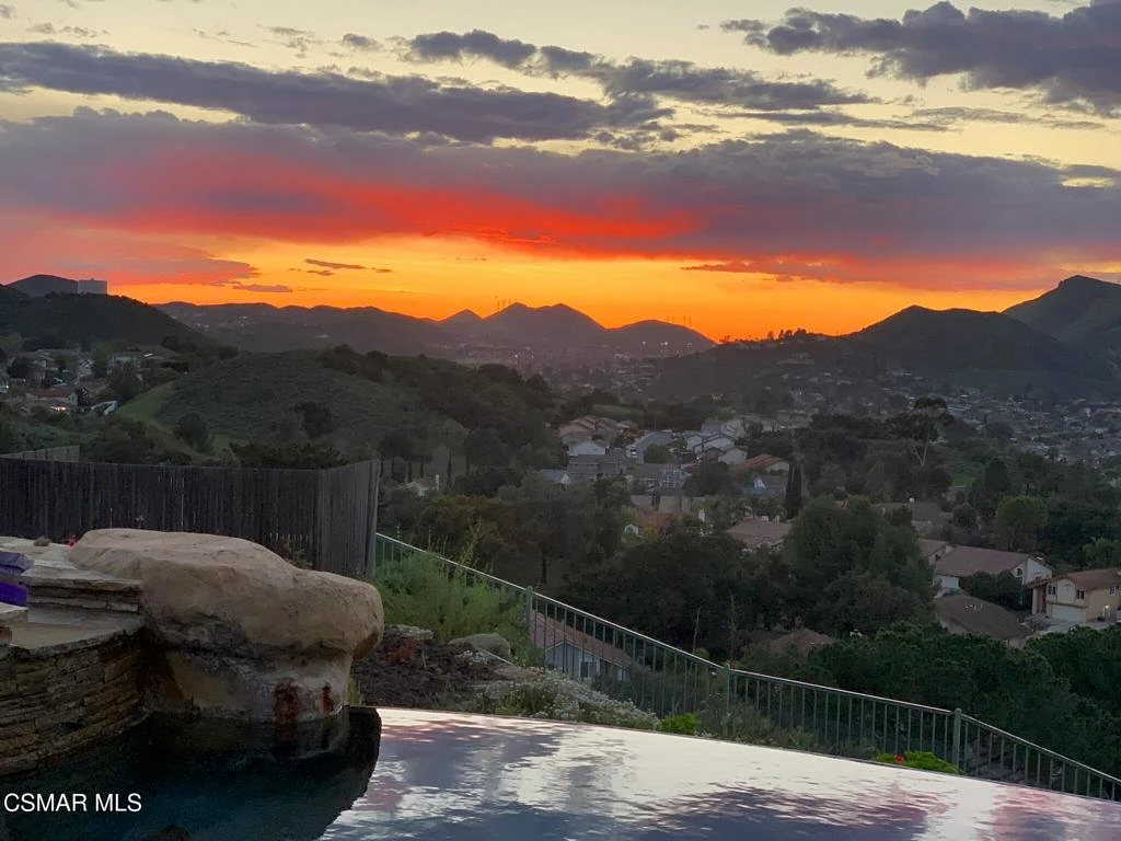 STUNNING custom estate with breathtaking PANORAMIC VIEWS of the Conejo Valley! Perched atop a scenic mountain on over 3 acres, this exceptional property offers nearly 4,000 square feet of refined living space, featuring 4 bedrooms and 4 bathrooms. Step inside to soaring ceilings, hardwood flooring, recessed lighting and an abundance of windows that flood the home with natural light while perfectly framing the incredible vistas. The expansive chef's kitchen is designed for both everyday living and entertaining, showcasing granite countertops, stainless steel appliances, rich maple cabinetry and an oversized center island with seating--all opening seamlessly to the inviting family room with a striking fireplace. The main level also features a gorgeous side deck with mountain views, a dedicated office, formal dining room, guest bathroom, laundry room, pantry and direct access to the 3-car garage, offering both functionality and convenience. Upstairs, the luxurious primary suite is a true retreat, complete with its own fireplace, private balcony capturing sweeping mountain views, a spacious ensuite bathroom with dual vanities and a generous walk-in closet. A secondary bedroom boasts a large glass slider leading to a private balcony with more stunning views, while the additional bedrooms offer ample closet space and picturesque surroundings. Two full guest bathrooms, a brand new infrared sauna for everyday luxury living, an office and a large gym or bonus room complete the upper level. Designed for ultimate indoor-outdoor living, the entertainer's backyard is nothing short of spectacular, featuring a pristine infinity pool, spa, cascading waterfall, fire pit and rose garden, all set against a dramatic natural backdrop. The expansive grounds provide ample space for entertaining/gardening and include a fruit orchard, as well as numerous outdoor amenities, with direct access to scenic community trails. Best yet, the home includes a Tesla roof with three backup batteries, so you can power your home with the sun and never miss a beat in a blackout. This one-of-a-kind view estate offers a rare opportunity to experience serene, elevated living surrounded by nature--yet just minutes from city conveniences. Welcome home!