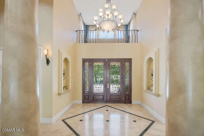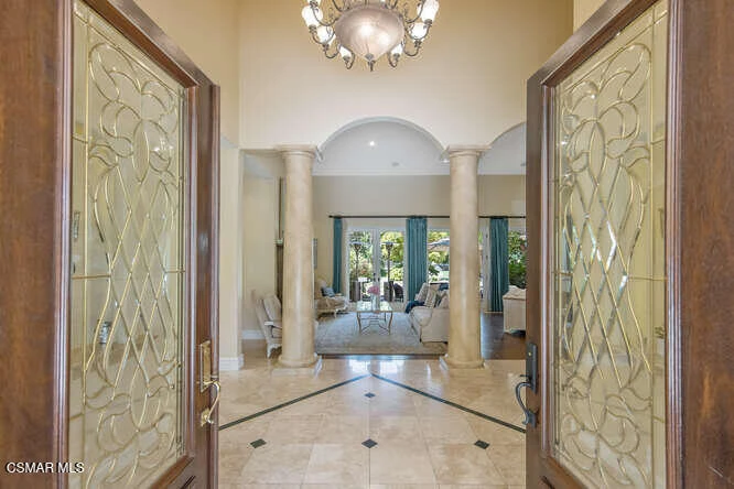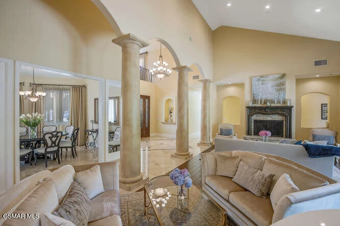 Beautifully appointed custom 6498 Square foot estate on 1.25 acres of park like grounds! This 5BD+8BA include two pirmary suites and is truly a destination location.The ground floor primary suite includes a dual- sided marble fireplace, spa tub, large glass shower, custom designed walk in closet, private patio that leads to the rear grounds. The second private suite includes a wet bar, private terrace with views of the grounds and full marble bathroom retreat along with a huge walk-in closet. This custom home features a gourmet chef kitchen w/ large island, custom cabinetry, gorgeous granite, stunning backsplash, SubZero, Wolf and Cove stainless steel appliances plus butlers pantry w/ warming drawer and wine fridge. Kitchen spills into oversized family room w/ custom cabinets and cozy fireplace. This home features a formal entry w/ stunning views of lush backyard, formal living room, formal dining room, oversized bedrooms.The yard features two built-in BBQ areas, two outdoor televisions, fire pit, putting green, working greenhouse, 4 fountain, 3, indoor fireplaces, sparkling pool with many rock waterfalls, and a huge water slide, spectacular walkways throughout, gorgeous rose garden, and an orchard with orange, lemon, apple, avocado, plum, peach, apricot and lime trees. The stunning guest house includes newer tile flooring, custom window coverings, a kitchenette and so much more.This is the haven you are looking for.