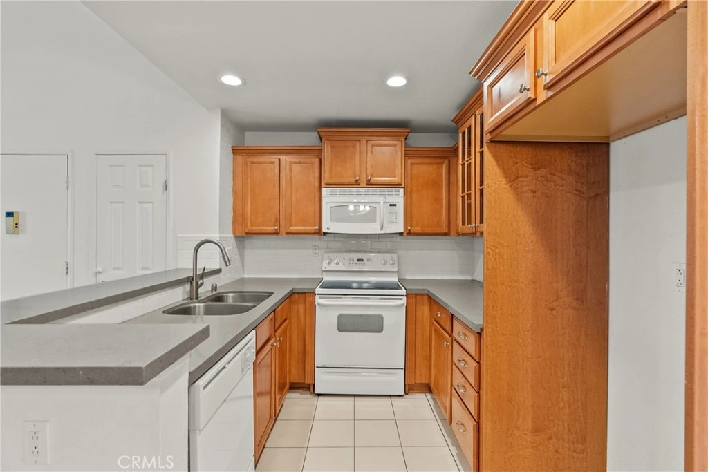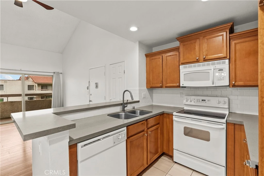 Welcome to this inviting upper level 2 bedroom 2 bath condo featuring soaring vaulted ceilings that create a light and airy atmosphere throughout. Thoughtfully upgraded, this residence offers beautiful laminate flooring complemented by decorative baseboards, along with tile in select areas for added style and durability. The remodeled kitchen is a standout, showcasing newer cabinetry with elegant glass front accents, sleek quartz countertops, and a classic subway tile backsplash. White GE appliances complete the space making it both functional and visually appealing. Adjacent to the kitchen, the dining area features a built in buffet and stylish floating shelves - perfect for everyday living and entertaining. Both bathrooms have been tastefully remodeled, offering modern finishes and comfort. The spacious primary suite includes a desirable walk in closet. Additional highlights include upgraded slider and windows, ceiling fan, balcony off living room with storage closet and views of the lush greenbelt in front of your home!