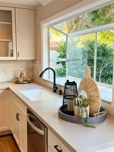 Welcome to this beautifully maintained and rarely available 4-bedroom, 2.5-bath end-unit home ideally located in the highly desirable Eastbluff community of Newport Beach—just steps from top-rated schools. Offering 1,564 square feet of living space, this home showcases pride of ownership with hardwood flooring, crown molding, recessed lighting, dual-pane windows, and plantation shutters throughout. The remodeled kitchen features stainless steel appliances, a 5-burner gas range, sleek countertops, and a garden window, opening to a private patio with a tranquil fountain—perfect for outdoor dining and entertaining. The main level includes a bright living room with a fireplace, formal dining area, office nook, and powder room. Upstairs offers a spacious primary suite and three additional bedrooms—an uncommon 4-bedroom layout in this community. Additional highlights include a finished garage with epoxy flooring and built-ins. Community amenities include pools and spa. Conveniently located near parks, shopping, dining, and just minutes to the beach.