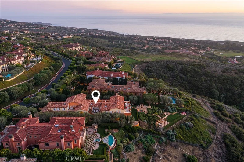 Ever-changing by day and night, the phenomenal panoramic views of 'Villa Saffron' are in a league of their own. They are experienced from both levels of the St. Tropez-inspired villa at guard-gated Pelican Crest in Newport Coast. The immersive vistas stretch across lush fairways, a canyon, the azure waters of the Pacific Ocean, Newport Harbor, San Clemente and Santa Catalina Island. Enchanting city lights reach as far as Palos Verdes. The terraced grounds tower 604 feet above sea level. They command front-row views that complement a backyard with upper and lower terraces, four lawn areas, loggias, custom fireplace/wood-burning pizza oven. The outdoor kitchen features a built-in 48" Lynx BBQ. Located close to the end of a private cul-de-sac, the villa showcases exquisite landscaping, a walled and gated front yard with a limestone colonnade pool, and a large, fireplace-warmed atrium. Spanning nearly 26,092 SF, the estate’s sumptuous homesite by EBTA architects, built by PrideMark, compliments an opulent interior that extends approximately 8,176 SF. It features four en suite bedrooms (one at entry-- currently used as an office), four full baths, and two half baths. An inviting foyer and grand staircase provides an elegant introduction to living areas including a media room, sunny office with enchanting views, a circular formal dining room surrounded by columns, and a spacious great room with an ornate hand-carved limestone fireplace. The chef’s kitchen boasts an oversized island, ocean-view breakfast room, butler’s pantry, two sinks, stone countertops, custom cabinetry, built-in side by side Sub-Zero refrigerator/freezer, steam oven, six-burner Wolf range, and double ovens. Note worthy materials include stone imported from France and Italy, antique French pavers, French white oak flooring, along with custom-made steel windows and French doors. All rooms except the media room offer access to an outdoor patio, terrace, loggia, or Juliet balcony, with the ocean-view primary suite boasting two decks, pocket doors at its entrance, a sitting room, two walk-in closets with custom built-ins, retractable sun shade, and luxe bath featuring a soaking tub and separate shower. Additional highlights include a 350+ bottle temperature-controlled wine cellar, wet bar, EV charging, full house water filtration and soft water by Water Techniques, Sonos sound system, Lutron lighting, as well as the option to build an ADU on the terraced lot with a spectacular view.