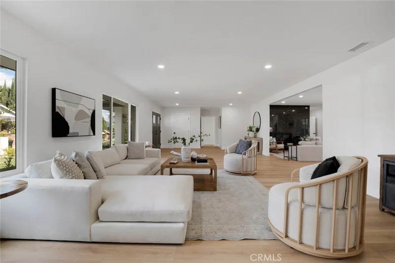 Striking, ranch-style, 5 bed, 3 bath, 3,529 sq ft mid-century home with sophisticated contemporary styling, high-end finishes, and maintaining the mid-century flair. Top to bottom remodel! Home is located on a view lot, hilltop, on a quiet and private cul-de-sac street. Exceptional curb appeal with a wide green lawn, manicured planted borders, sleek modern lines, and custom wrought iron decorative gates, offering both security and statement. Double front door entry leads to a sweeping open-plan interior defined by warm floors, recessed lighting and a seamless flow between spaces for flexible configuration and effortless entertaining. Formal living and dining open into the informal family room anchored by a stunning black marble fireplace. The space is fully open to a show-stopping chef’s kitchen centered around a dramatic waterfall quartz island, accented by contrasting black shaker cabinetry, with breakfast bar seating and integrated 5-burner gas range, white shaker cabinets with contemporary hardware, quartz countertops, white subway tile backsplash, farmhouse sink, and brand-new, stainless-steel appliances including double ovens. An adjacent, cozy breakfast nook with statement chandelier offers sliding glass doors opening to the expansive rear patio. In the west wing is a large bedroom with a sliding glass door out to the yard, and a remodeled ¾ bath with direct pool access, making it perfect to act as a guest wing or home office. In the east wing, the spacious primary suite boasts a sliding glass door to the patio, dual closets, and a spa-inspired bath with dual-sink quartz vanity, oversized shower, and separate claw-foot soaking tub. Three additional, large bedrooms share a beautifully updated ¾ bath with stylish design features. The backyard is a private retreat with a generous in-ground pool, a very large covered patio perfect for enjoying summer BBQs and dining al fresco, and a serene pagoda with fire pit for relaxing or entertaining, all framed by lovely mountain views. Additional highlights include indoor laundry with utility sink, direct access to a 3-car garage, and gated. Open-air RV or boat parking to the west side of the house. Situated near shopping, dining, and recreation in the heart of Northridge. Don’t miss out on the rare blend of timeless ranch architecture and refined modern living embodied by this home.