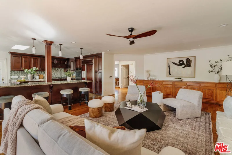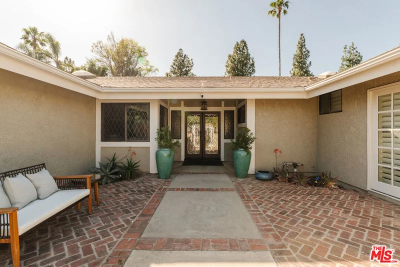Imagine life in this stunning estate set on a rare double cul-de-sac! A gated courtyard guides guests toward the dramatic glass-inlaid entry of this sprawling one-story home, where rich woodwork frames the foyer and refined dining alcove. The adjacent pub-style bar glows beneath stained glass, an inviting spot for conversation or preparing your favorite cocktail. The sunken living room's elegant fireplace is illuminated by a pair of skylights and flanked by French doors that open into a screened in sunroom filled with natural light. Hardwood flooring, recessed lights, and crown molding enrich the expansive family room, where a striking fireplace and glass doors create a seamless connection to the outdoors. Your kitchen blends style and function with handsome cabinetry, ample counter space, and a multi-seat island. Retreat to the impressive primary suite and rejuvenate within its sauna, dual dressing areas, and ensuite soaking tub. Outside, your entertainer's backyard feels like a resort with drought-tolerant California native plants and citrus trees, and the perfect spot to start your vegetable garden. The yard also features a built-in grill, a sparkling pool and spa, and a pickleball/basketball court! A detached shed becomes an ideal remote office and a fabulous attached 3-car garage, too! Paid-off solar panels add everyday practicality, and other notables include the 2-year-old roof. You're only moments from CSUN, CA-118, I-405, Northridge Fashion Center, and a wide selection of fabulous restaurants. Come experience a residence where entertaining and comfort come together effortlessly!