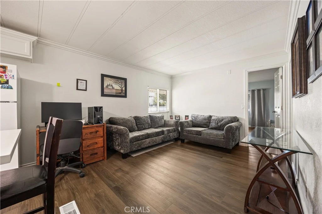 Beautifully remodeled 3 bedroom, 2 bath manufactured home located in the charming small town of Nuevo. This inviting home offers a bright open-concept kitchen and family room, complemented by a separate living room and formal dining area with built-in cabinetry. The fully remodeled kitchen features granite countertops, gorgeous glass tile backsplash extending to the cabinetry, farmhouse sink, white appliances, and premium finishes throughout. The spacious primary suite includes a private bath with relaxing garden tub and separate shower. Two additional well-sized bedrooms provide flexibility for guests, family, or home office use. Enjoy easy-care front and back yards, mature palm trees, covered front patio with privacy lattice, and ample covered parking. Two storage sheds offer additional convenience. Major upgrades completed in 2020 include vinyl windows, remodeled kitchen and bathrooms, premium vinyl flooring, new ducting for HVAC system , and updated interior gas piping. Additional recent improvements include a new roof (approximately six months old) and leased solar system for energy efficiency.