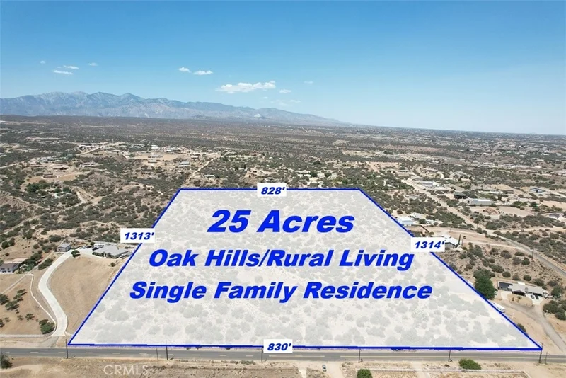 25 ACRE PRIME LAND in Oak Hills, California, with water, power, and gas on the street. Nestled between paved Oak Hill Rd with 830ft frontage and Joshua Road 660+/-ft frontage, just a short 3-mile drive to the I-15 Fwy North/South Interchange at Ranchero Rd, and a short drive to all the amenities in all the High Desert. This property can be subdivided into 10-2.5 acre or 5-5 acre buildable lots for a multi-unit development, or proceed with your plans and build out your exclusive dream castle at “The Upper 4+/- acre flat Deck” at the northwest corner of this lot for a large Ranch type setting with rolling hills, and breath taking views of the mountains which makes it one of the best building paths in the area, and private space. Custom Homes surround this location, providing the perfect balance of privacy and community, just minutes away from the mall, grocery stores, other major retail stores, and Schools. Don't miss out on making this your dream Home or project.
