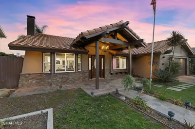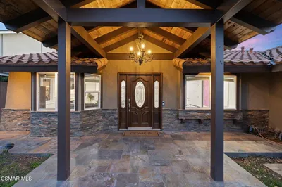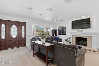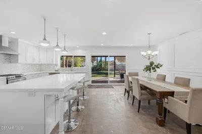Beautiful, open, and bright, this professionally designed and tastefully updated single-story 3-bedroom, 2-bath home offers an exceptional living experience with thoughtful upgrades throughout.The warm and inviting family room features a charming bay window with built-in bench seating, custom wall wainscoting, and a stunning stone fireplace with custom mantel. The space flows seamlessly into the kitchen, creating an open layout ideal for everyday living and entertaining.The fully renovated kitchen has been beautifully reconfigured and features custom white cabinetry, quartz countertops, designer backsplash, stainless steel appliances, and a large island with seating. Custom wall wainscoting continues in the kitchen, adding architectural character and continuity to the living spaces. The kitchen includes a dining area and opens through expansive sliding glass doors to a stately covered patio with ceiling fans, custom stamped concrete and a very spacious backyard, creating seamless indoor-outdoor flow. Enjoy scenic mountain views from the kitchen or private yard while preparing meals and comfortable year round entertaining.The primary suite offers a walk-in closet, ensuite bathroom, and custom sliding glass doors that open to the rear yard. Two additional generously sized bedrooms provide versatility and comfort. The secondary bathroom is tastefully renovated with a custom vanity, beautiful tile floors, and custom-tiled shower.Practical features include an oversized, fully finished two-car garage with indoor laundry and custom built-in storage. Additional parking is available via the spacious driveway and street parking. The owner previously obtained approved plans for an ADU (Accessory Dwelling Unit). Buyer to verify current permit status and feasibility.Located within the highly acclaimed Oak Park School District, with convenient access to dining, shopping, and just a short drive to Malibu and Zuma beaches.