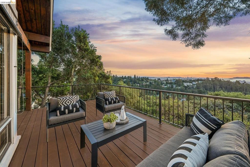 Perched on a sunny hillside in the coveted Montclair Hills, this custom Lindal Cedar home offers breathtaking panoramic views of the San Francisco skyline, Bay and Golden Gate Bridges, city lights and Marin. Soaring vaulted ceilings, warm wood beams, and walls of windows highlight the home’s striking architecture and open-concept design, filling the space with natural light. The spacious living area flows seamlessly into an updated custom kitchen featuring a Kohler apron sink, Silestone quartz countertops, and premium cabinetry. Expansive decks provide ideal spaces for entertaining, sunset views, and enjoying the surrounding nature. The upper level includes two bedroom suites with beautifully updated baths, custom tile, glass shower doors, and built-in closet systems. A versatile lower-level third suite is perfect for an au pair, office, or in-law unit, with its own deck for added privacy. The landscaping features mature foliage, grand agaves and a lovely maple. Additional highlights include solar panels, dual-pane windows, solid wood doors, and a two-car garage with ample storage. Conveniently located near Montclair Village with a storybook cottage library, dining and shopping, a park and tennis courts, and easy SF access, this home blends modern comfort with natural beauty. Views: Downtown