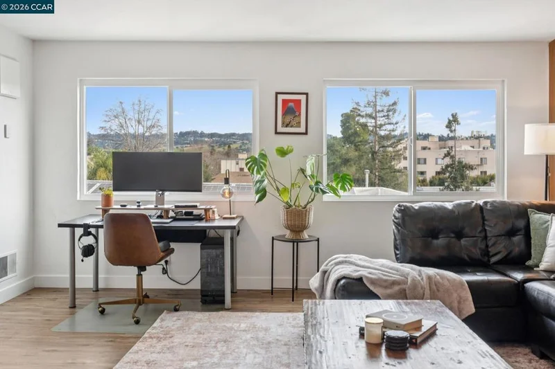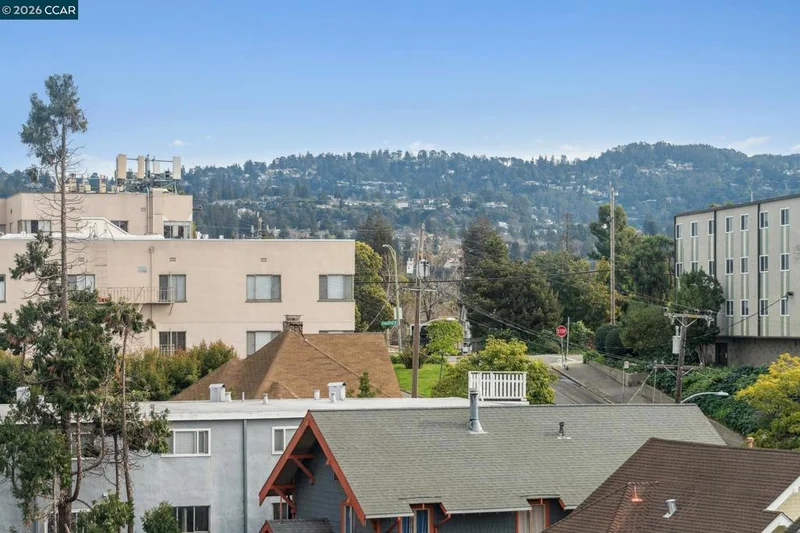 Elevate your lifestyle in this stunning top-floor retreat where authentic Mid-Century character meets a thoughtful recent update. Ideally situated in the heart of Adams Point, this private sanctuary offers the rare luxury of no neighbors above and just one shared wall, creating a peaceful, light-filled escape framed by expansive windows and sweeping hill and neighborhood views. The open-concept living space is anchored by a striking floor-to-ceiling, wood-paneled feature wall that honors the building’s architectural heritage. The chef’s kitchen is a modern showpiece, featuring intricate geometric tile, European-style cabinetry, and sleek quartz countertops—designed for both everyday living and effortless entertaining. The elevated design continues in both bedrooms with custom textured and geometric wallpaper accents, evoking a refined, boutique-hotel feel. A truly coveted highlight is the rare in-unit laundry, offering unmatched convenience, along with secure garage parking and elevator access—all set within one of Oakland’s most walkable and vibrant neighborhoods.