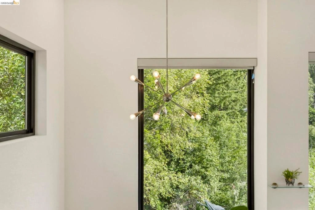 Designed by Oakland-based, boutique residential design architect John Newton, 45 Homeglen is a striking modern residence tucked on a quiet lane in Montclair—minutes from the shops, restaurants, & vibrant Sunday mornings of Montclair Village. This 2020-construction home has been thoughtfully designed and meticulously maintained. An open floor plan welcomes you with oversized windows framing lush views from nearly every room. It feels like living among the treetops—even from the chef's kitchen, with marble countertops, a waterfall island, sleek appliances, & designer fixtures. Dining and living areas are crowned by a signature butterfly roof for dramatic ceiling height and wonderful scale. An oversized sliding door opens to an expansive glass-walled deck with unobstructed skyline views. The lower level offers a serene primary suite w sunny bath and direct deck access, two additional bedrooms, and another full bath. Upgrades incl A/C, whole-home reverse osmosis, motorized shades, and a pantry. The rear yard has exciting potential—garden, or a perhaps a detached structure (ADU plans avail). Ample storage and a 2-car garage w/ internal access. Close to Huckleberry and Sibley Regional Parks, coveted Montclair schools, and the wooded setting that makes Homeglen Lane so special.