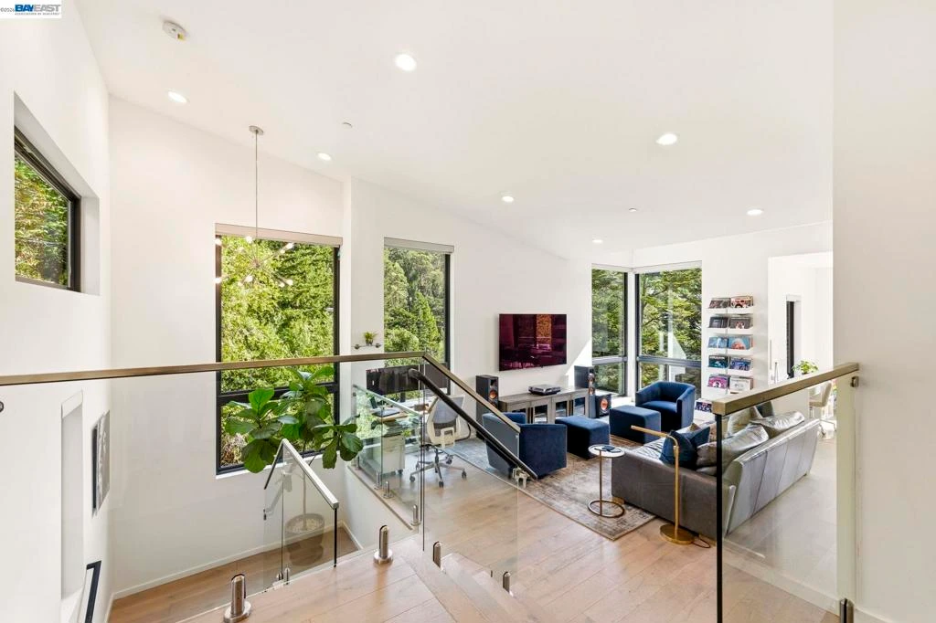 Designed by Oakland-based, boutique residential design architect John Newton, 45 Homeglen is a striking modern residence tucked on a quiet lane in Montclair—minutes from the shops, restaurants, & vibrant Sunday mornings of Montclair Village. This 2020-construction home has been thoughtfully designed and meticulously maintained. An open floor plan welcomes you with oversized windows framing lush views from nearly every room. It feels like living among the treetops—even from the chef's kitchen, with marble countertops, a waterfall island, sleek appliances, & designer fixtures. Dining and living areas are crowned by a signature butterfly roof for dramatic ceiling height and wonderful scale. An oversized sliding door opens to a glass-walled deck with peaceful verdant views. The lower level offers a serene primary suite w sunny bath and direct deck access, two additional bedrooms, and another full bath. Upgrades include A/C, whole-home reverse osmosis, motorized shades, and a customized storage. The rear yard has exciting potential—a garden, or a perhaps a detached structure (ADU plans avail). Ample storage and a 2-car garage w/ internal access. Close to Huckleberry and Sibley Regional Parks, coveted Montclair schools, and the wooded setting that makes Homeglen Lane so special.
