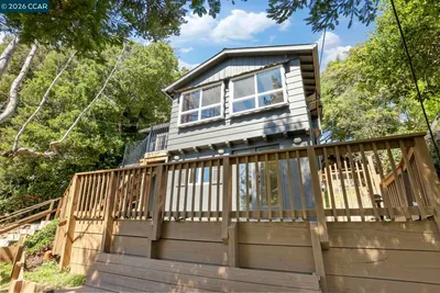Beautifully updated 1925 cabin-style home, perfectly blending rustic character with modern comfort. The 3 bedroom 1.5 bath main residence is approx. 1,538 sq. ft. and features a welcoming stone fireplace, hardwood floors, wood-framed windows, exposed beam ceilings, and classic paneling—all reflecting the home’s original craftsmanship. The remodeled kitchen pairs natural wood cabinetry with upgraded stainless steel appliances, including a gas cooktop, double ovens, built-in microwave, and dishwasher. The lower-level studio (approx. 438 square feet) offers a private entrance, tile floors, a full kitchen, separate bathroom, and versatile living space—ideal for guests or rental income. Nestled among stately oaks, the property embraces nature with stamped concrete walkways, outdoor patios, and filtered views of downtown Oakland. Other outdoor upgrades include a spacious and level concrete terraced yard ideal for entertaining and a new front deck for soaking in the views of natural beauty plus a glimpse of the Bay. A spacious two-car garage/storage unit sits at the top of the lot, adding convenience and functionality. Just minutes from downtown Montclair, with local shops, restaurants, and grocery stores, plus convenient connections to Highway 13 and Highway 24. Open 3/22.