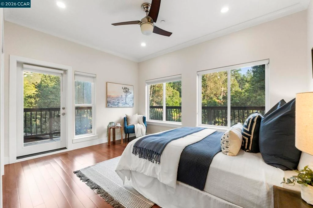 Newer construction in Montclair where quality of life matches the quality of construction! Completed in 2013 with sweeping views of the lush hillsides, the home still feels like new. The entry level includes a living room, guest bedroom and full bath. A grand staircase leads to an open-concept main level with family room, dining room, kitchen, office, half-bath, laundry and sunroom. Designed for ease of cooking and entertaining, the kitchen features an island, granite counters, gas stove and extensive storage/pantry options. Three more bedrooms are located on the upper level including the primary bedroom with walk-in closet and en-suite bath with soaking tub and shower. Additional features include owned solar, hardwood floors, crown molding and fresh interior paint. The home includes multiple outdoor spaces with several large patios, decks and gardening areas with raised beds. Work from home in the tranquility of the detached office overlooking the play area with swings, slide and views. The gated driveway leads to a one-car garage with EV charger and spacious storage area. A bonus basement adds space for a gym, office or more storage. Just up from Thornhill Elementary and minutes from Montclair Village and Hwy 13, the ideal mix of privacy and convenience!