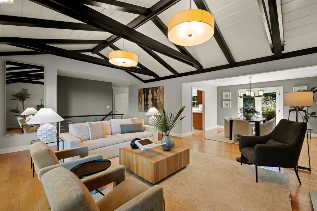 6611 Ascot Dr is a stunning mid-century 4 BD, 3 BA retreat with dazzling Bay views, spanning a sweeping 2,734 sq ft on a 9,112-sq-ft lot off Skyline in private Piedmont Pines. Enjoy vaulted open-beam ceilings, hardwood floors, fireplaces, two ensuite bedrooms and view decks, upgraded kitchen and baths, two-car garage parking, and an ideal two-level floor plan. The main level features a primary suite with bay views and deck access plus two more bedrooms and a bath, and the kitchen, dining room, and living room. The kitchen boasts a six-burner Wolf range, double Fisher & Paykel wall oven, pastry island, and views of the front yard: lemon tree, Redbud trees, Japanese maple, and more. Through the dining room is a massive living room with soaring ceilings, modern fireplace, and sliding glass doors to the upper deck with North Bay views. Downstairs offers a large, carpeted family room with second fireplace and access to the lower Bay-view deck, and a big laundry room. The true primary suite here finds a fourth bedroom with bay views, vanity room, walk-in closet, and spa-like bathroom with shower and soaking tub. 6611 Ascot Dr is perched on a verdant hillside lot in a fantastic location off Skyline, with East Bay Regional Parks, Montclair, and Lamorinda mere minutes away.