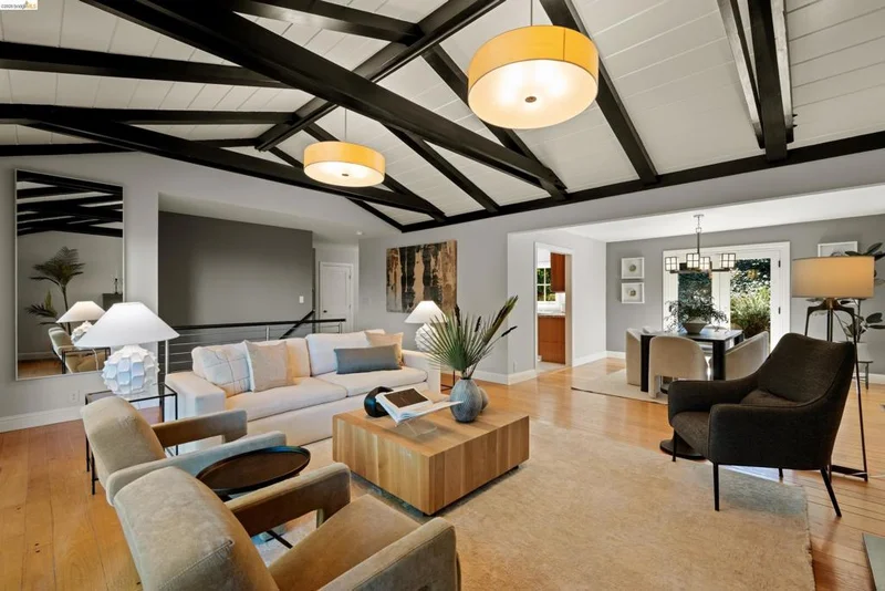 6611 Ascot Dr is a stunning mid-century 4 BD, 3 BA retreat with dazzling Bay views, spanning a sweeping 2,734 sq ft on a 9,112-sq-ft lot off Skyline in private Piedmont Pines. Enjoy vaulted open-beam ceilings, hardwood floors, fireplaces, two ensuite bedrooms and view decks, upgraded kitchen and baths, two-car garage parking, and an ideal two-level floor plan. The main level features a primary suite with bay views and deck access plus two more bedrooms and a bath, and the kitchen, dining room, and living room. The kitchen boasts a six-burner Wolf range, double Fisher & Paykel wall oven, pastry island, and views of the front yard: lemon tree, Eastern Redbud trees, Japanese maple, and more. Through the dining room is a massive living room with soaring ceilings, modern fireplace, and sliding glass doors to the upper deck with North Bay views. Downstairs offers a large, carpeted family room with second fireplace and access to the lower Bay-view deck, and a big laundry room. The true primary suite here finds a fourth bedroom with bay views, vanity room, walk-in closet, and spa-like bathroom with shower and soaking tub. 6611 Ascot Dr is perched on a verdant hillside lot in a fantastic location off Skyline, with East Bay Regional Parks, Montclair, and Lamorinda mere minutes away.