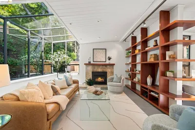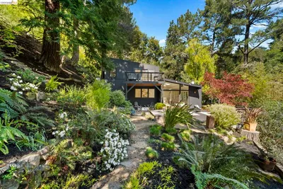 Wooded Montclair Hills Retreat on Private Road. Set on over 1/3 acre along a private road, this distinctive Oakland Hills residence offers exceptional privacy w/flowering trees, lush native plantings, mature wooded grounds & a relaxed Big Sur atmosphere rarely found this close to the city. The main level is anchored by a den w/dramatic corner wall of glass offering uninterrupted views into the surrounding tree canopy. The adjacent chef's kitchen features maple floors, a large center island w/custom hardwood top, stone countertops, stainless steel appliances & pendant lighting, w/a natural flow toward the den ideal for entertaining. A dining room connects to a sunken living room w/its own fireplace & slider doors opening onto rear gardens & spacious decks w/a Japanese-style wood hot tub & elevated forested views. Upstairs, the primary suite includes a refreshed bath & private deck, w/two additional bedrooms w/forested outlooks & a refreshed hall bath completing the upper level. A pergola-beamed two-car garage w/direct interior access & a classic Airstream ideal as a home office complete the grounds. Backup generator & EV charger included. Minutes from Montclair Village shops & restaurants & nearby railroad trail, access & Highway 13. Open Saturday & Sunday, come fall in love!