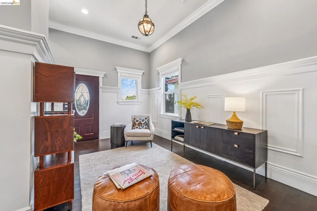 Stunningly imaginative Victorian renovation in Oakland’s Hoover Foster neighborhood! Dramatic open floor plan with 12 foot ceiling heights throughout the main floor. Exceptional workmanship exhibited by the custom millwork wainscoting and crown molding. The cook’s kitchen, separated from the dining area by a quartz-topped peninsula, is bedecked in period-appropriate cabinetry and lighting. The generous, well laid out living space is outfitted with 4 bedrooms and 3 luxurious baths with abundant use of stone and tile. Outdoor spaces include a deck adjacent to the kitchen, a peaceful patio outside the primary suite, and beautifully landscaped and hardscaped gardens, front and back!