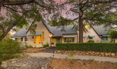 Ojai Treasure! Located on one of Ojai's most prestigious streets, this masterfully restored Tudor Revival estate--originally built in the 1920s and designated as a Historic Landmark--offers a rare blend of grand architectural significance and modern refinement. Designed by renowned architect William A. Edwards of Edwards & Plunkett, one of Santa Barbara's most celebrated firms of the era, this exceptional turn-key property seamlessly combines timeless elegance with contemporary comfort, all while benefiting from the Mills Act for significantly reduced property taxes. Set on approximately 1.16 stunning acres, the estate offers a versatile, thoughtfully designed compound, including a 3-bedroom plus office/den main residence with 3 full and 2 half baths; a charming 1-bedroom, 1-bath guest cottage designed by Austen Pierpont; and a detached studio ideal for painting, music, photography, or artistic pursuits. The main residence is defined by dramatic pitched cathedral ceilings, exposed wood beams, rich oak flooring, and graceful arched doorways. Thoughtful upgrades have been carefully integrated throughout, preserving the home's historic character while enhancing everyday livability. The sitting room, butler's pantry, and gourmet kitchen--complete with a legendary AGA stove--reflect a refined balance of original charm and high-end functionality. The luxurious primary suite offers a bespoke retreat, featuring separate his-and-hers bathrooms and dressing rooms. The park-like grounds unfold as a private sanctuary, complete with a tranquil pool, mature trees, fruit orchards, seasonal lavender fields, vegetable gardens, a chicken coop, and a serene courtyard. Multiple terraces capture sweeping mountain views, creating an idyllic setting for both relaxation and entertaining. Ideally located just minutes from the renowned Pratt Trailhead and downtown Ojai's fine dining, farmers' markets, wine tasting rooms, and the world-class Ojai Valley Inn, this is a rare architectural jewel that embodies the relaxed sophistication and creative spirit of the Ojai Valley. Welcome Home!