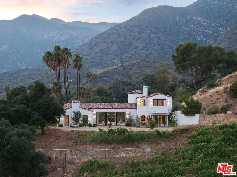 Perched on a private knoll in Ojai's coveted East End, this 2023-built estate blends modern Mediterranean design with refined living. The 5,100 sq ft villa sits on nearly two secluded acres and includes a fully licensed, organically farmed boutique vineyard with over 1,300 mature vines.Thoughtfully crafted with top-tier materials, the home features a dramatic great room with 12-foot ceilings, floor-to-ceiling French doors, groin-vaulted ceilings, and a sculptural circular staircase. White cement floors, hand-plastered walls, and arched passageways add timeless elegance.Designed for both entertaining and everyday luxury, the chef's kitchen boasts Sub-Zero refrigeration, Fisher & Paykel ovens, and Waterworks fixtures, flowing into open dining spaces and a veranda perfect for enjoying Ojai's "Pink Moment" sunsets.Four private bedroom suites, each with spa-style baths and outdoor terraces, provide serene retreats. The grounds offer ancient oaks, an olive allee, drought-tolerant gardens, a heated pool, spa, and multiple outdoor living areas.This estate combines beauty with function. Plans for an ADU, a potential winemaking facility, and safety features like fire-resistant materials, private hydrant, and emergency turnaround ensure long-term peace of mind.A rare blend of design, nature, and opportunitythis East End estate is more than a home; it's a legacy.