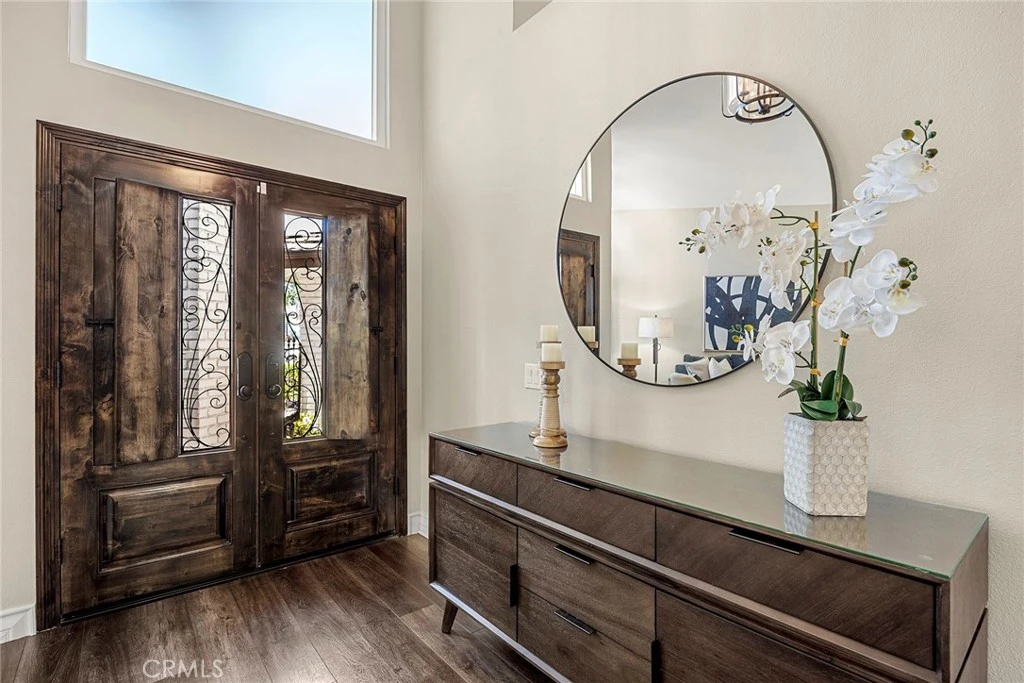 Welcome to this move-in ready 4-bedroom, 3-bathroom home located in the desirable Santiago Hills community of Cowan Meadows in the City of Orange. With a functional layout, inviting living spaces, and thoughtful updates throughout, this home offers comfort and flexibility for a variety of lifestyles. A gated walkway leads to custom double doors that open into a welcoming foyer with a curved staircase. The living and formal dining areas feature vaulted ceilings, creating a bright and open environment. Interior upgrades include new carpet, new vinyl flooring, refreshed kitchen cabinetry, and updated bathrooms with new vanities, sinks, fixtures, toilets, and finishes. The kitchen features quartz countertops and opens directly to the family room, complete with a fireplace—creating a central gathering space for everyday living. Sliding access to the backyard provides a seamless indoor-outdoor connection, ideal for hosting and enjoying time at home. The backyard offers a covered patio and a saltwater pool with a pebble finish, updated tile, heater, and filter—providing a great setting for outdoor enjoyment. A downstairs office provides flexible living space and may be converted to a bedroom. Conveniently located near parks, dining, shopping, and outdoor recreation, including nearby nature trails and open spaces. This home is situated in a well-established Orange community with access to a variety of local amenities.