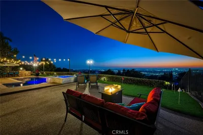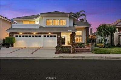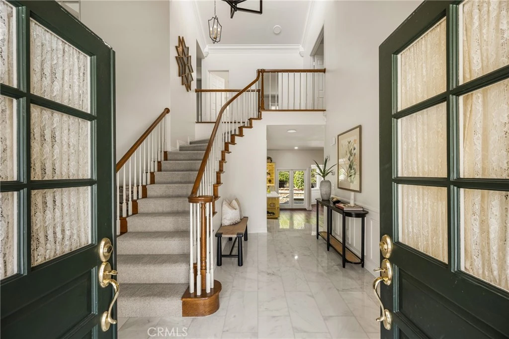 Welcome to this beautifully appointed 5 bed, 4 bath residence on a cul-de-sac, offering 4,216 sqft of thoughtfully designed space & resort-style living. Blending architectural charm & modern updates, the home’s exterior showcases Cape Cod & Colonial Revival influences highlighted by a welcoming covered front porch & circular driveway creating impressive curb appeal. Enter the grand two-story foyer with luxurious Carrera marble flooring & into an open & inviting floor plan, offering elegant formal living & dining rooms. The heart of the home is a French country-inspired kitchen, featuring warm, muted tones & classic elements that evoke timeless cottage charm, while providing an inviting space for family gatherings. Kitchen opens to casual dining area overlooking the pool & expansive family room, featuring custom wainscotting & a fireplace as the centerpiece of the room. Hardwood flooring throughout much of the first level adds a sense of continuity to the space. The downstairs includes a generously sized bedroom/office, remodeled bath & large laundry room with storage & direct outdoor access - perfect for pool days. The home has been extensively upgraded; beautifully remodeled baths displaying modern finishes & new carpet & paint, all adding warmth & style throughout. Upstairs, the primary suite serves as a private retreat, featuring a fireplace & offering a peaceful sanctuary at anytime. Elegantly remodeled primary bath features a luxurious soaking tub, quartz surfaces & gold finishes, creating a perfect place to relax & recharge. A separate walk-in shower with custom tile & toilet area offers additional privacy. The large bonus room, with soaring ceilings, is an addition & unique to this floor plan. With its own kitchen area/bar & remodeled bath, it provides exceptional flexibility as a media room, guest room, gym or playroom. Second level includes a stunning full bath shared with 3 large secondary bedrooms, separate from the primary suite for ultimate privacy. Designed for true SoCal living, step outside to an entertainer’s paradise featuring a sparkling pool & spa. A fully equipped outdoor entertainment area has a kitchen with a new grill, as well as green space for kids/pets. The private & expansive outdoor space complements the home’s impressive interior. Completing the home is a 3 car garage, ready with 220V for an EV. With timeless design, classic style, modern upgrades & resort-style amenities, this residence is the perfect place to call Home!