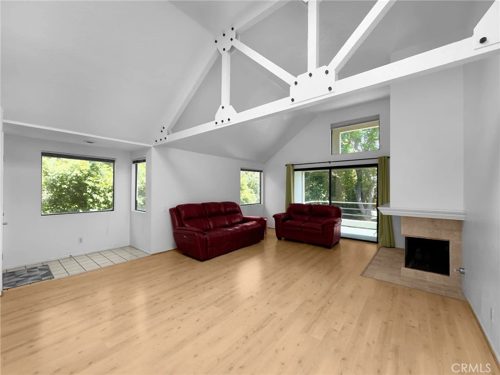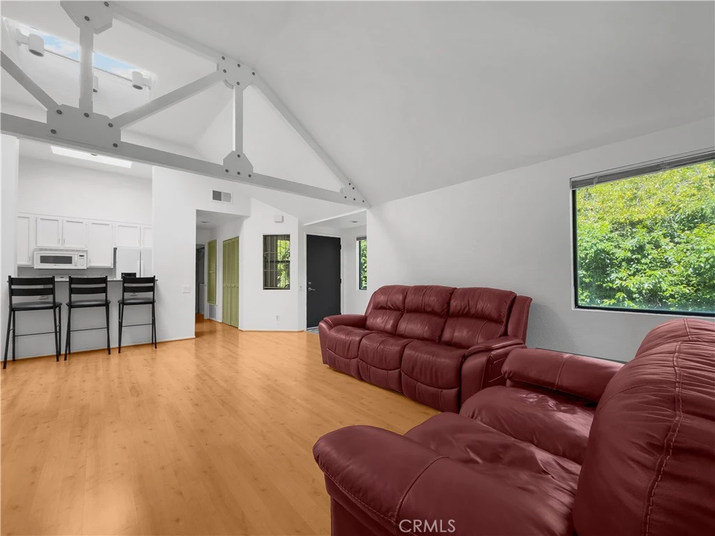 Welcome to this light-filled and inviting one-bedroom, one-bath home, nestled in a peaceful setting surrounded by mature trees. Step inside to soaring 11-foot ceilings with open beams and skylights that bring in an abundance of natural light, creating a bright and uplifting space you’ll love coming home to. The cozy living room features a fireplace and opens to a private balcony—perfect for relaxing and enjoying the outdoors. The kitchen offers white cabinetry, granite countertops, and plenty of storage, flowing easily into the dining area with bar seating and its own skylight, making everyday living and entertaining feel effortless. The spacious primary bedroom is a true retreat, featuring high ceilings and a large closet that provides ample storage. Warm bamboo flooring, in-unit laundry with full size washer and dryer with additional storage, inside storage closet and a private deck storage closet. This home blends comfort, charm, and convenience beautifully offering a space that truly feels like home the moment you walk in. Includes a 1-car garage and ample guest parking. Close to parks, shopping, restaurants and El Modena Wilderness area. Your own private retreat in the highly desirable Villeurbanne community of Orange. Hurry, won't last!