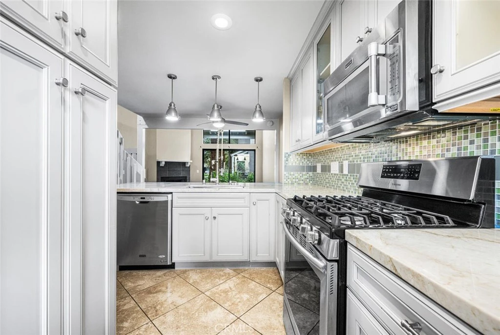 This beautifully upgraded 2-level townhome is located in the sought-after "Morningside on the Lake" community. It features a fully upgraded 1-bedroom, 1-bath unit situated in a very private corner of the complex, just steps away from Hart Park. The kitchen boasts custom soft-close cabinetry enhanced with dimmable pendant lighting and under-cabinet LED lighting, along with a quartz countertop, large brushed stainless steel sink, and a pull-down kitchen faucet. A custom glass-tile backsplash and a garden window with glass tiles complete the elegant look. The bathroom has been fully remodeled with custom plumbing that includes a separate valve for temperature adjustment. You'll find a modern tub, travertine tile surround, travertine flooring with marble accent tiles, linen closet, quartz countertop, double-mirrored medicine cabinet, decorative vanity mirror, and upgraded dimmable lighting. Additional features include newer flooring in the downstairs living room and upstairs loft, upgraded Levolor blinds with remote control, a reverse osmosis system, and a rebuilt staircase with a banister. The townhome also offers 2 carport spaces and easy access to the 5, 55, and 22 freeways.