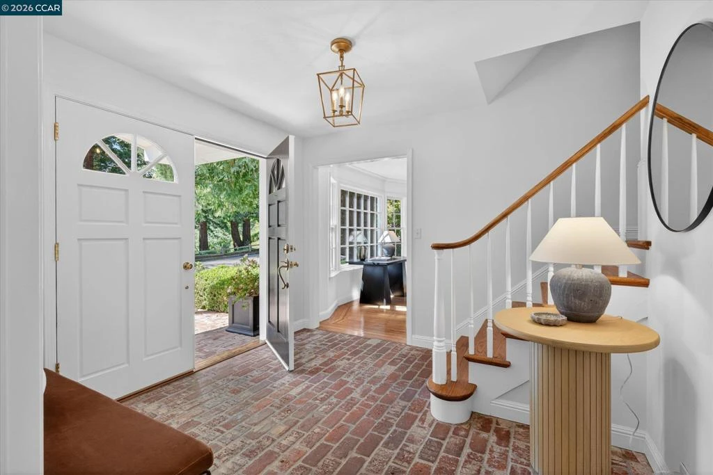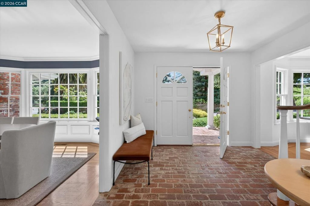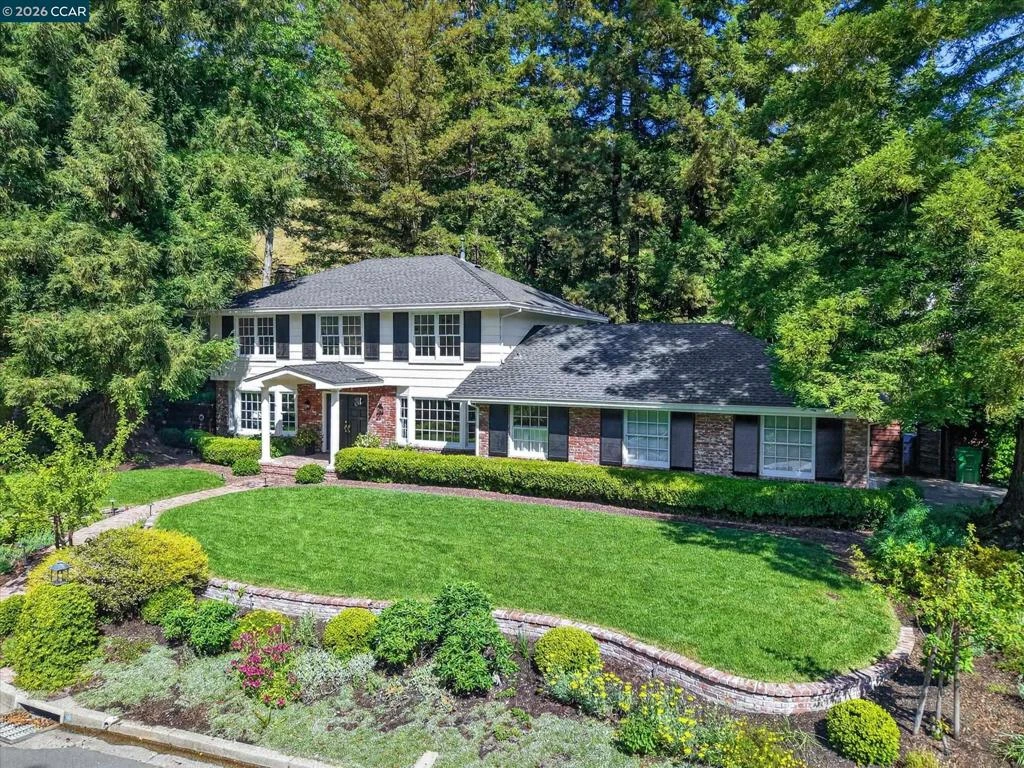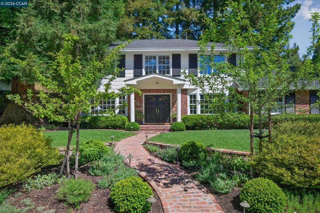 From the moment you arrive, 20 Coachwood Terrace makes an impression — a winding brick path through manicured gardens leads to a stately white and brick Traditional framed by towering redwoods. Inside, original brick entry floors and a gold lantern pendant open to a gracious floor plan filled with light and detail. The formal living room features a white-mantled fireplace and garden-view windows, while the wood-paneled family room with brick fireplace and French doors is perfect for easy entertaining. A crystal-chandelier dining room with paneled wainscoting and bay window dazzles, and the bright white kitchen offers stainless appliances and garden views. A sunny breakfast nook opens to the deck and rear yard for seamless indoor-outdoor living. The expansive primary suite offers treetop views and a spa-like bath with double granite vanity and glass-enclosed shower. Three additional bedrooms — including one with sweeping hillside views — are served by a second full double-vanity bath. Award-winning Orinda schools, BART access, and Theatre Square minutes away. For more information visit 20caochwoodter