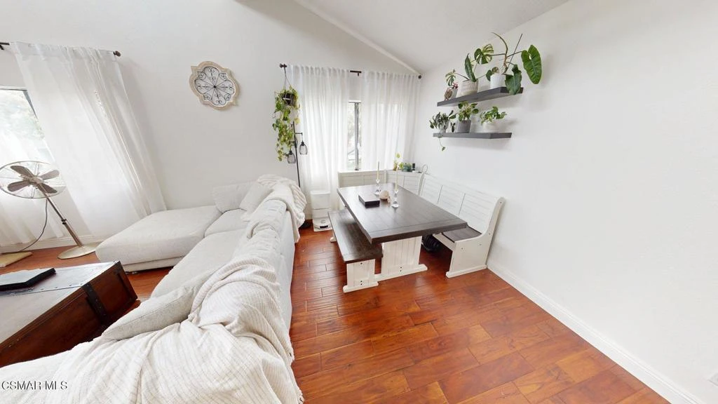 Beautiful move-in ready one bedroom with a second 10x7.6 room that could be used as a small nursery, currently used as an office, beautiful updated cabinets, customquartz counters, custom backsplash, stainless steel appliances, wood-like floors, private patio off the master suite, updated bathroom, high vaulted ceilings, lots of windows shows light and bright. Detached the car garage, washer, dryer,and the refrigerator included.
