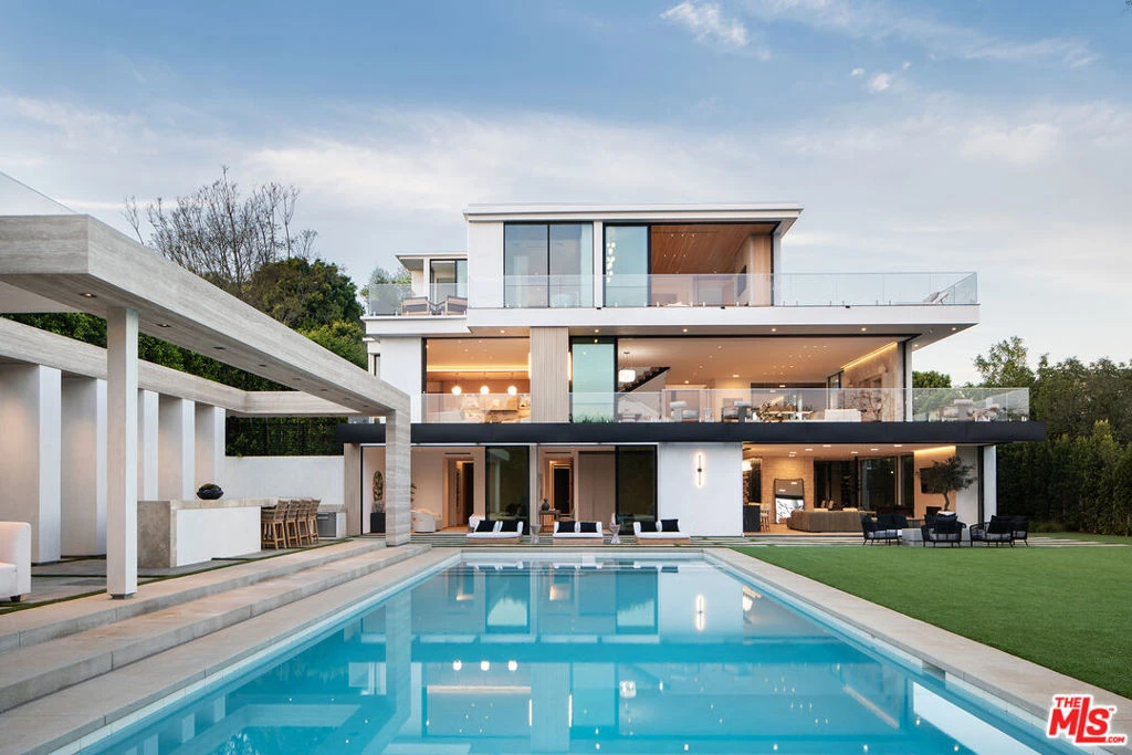 Presenting a brand-new, masterful 2026 build of exquisite design and architecture, newly completed in Pacific Palisades' coveted Upper Riviera with jaw-dropping ocean and city views plus a huge yard. Lush, carefully manicured trees and landscaping provide contrast to the home's stone, metal, and glass facade, fusing the composition with its natural environment. An 11-foot-high pivot door welcomes guests into the light-filled foyer with a beautiful double-height space and wide-plank oak floors that can be found throughout the estate. At the center of the home there is a three-story floating staircase, flooded with natural light to illuminate each floor. Enjoy unique, premier amenities throughout, including two full wet bars on both entertaining levels, a car lift with Carousel USA turntable in the two-story garage, glass vehicle display, elevator, Fleetwood doors, and a total of 2,000 square feet of upper deck space. The gourmand's kitchen includes chef-grade Gaggenau luxury appliances and a gorgeous Taj Mahal marble display wrapping the hood and flowing across backsplash and center island. There is also a caterer's prep kitchen dressed in lady white marble. The primary suite has incredible volume with a book-matched fireplace and floor-to-ceiling glass that opens to striking ocean views from the 1,300-square-foot wraparound deck. The spa-inspired bath has a giant shower with soaking tub plus dual floating vanities with smart mirrors and makeup desk, and the large walk-in closet is equipped with custom built-ins and dresser island. The lower level has a sauna, gym, 640-bottle wine storage, large theatre with Silver Wave marble snack bar, and two secondary bedrooms that access the resort-like rear grounds. In the 9,000-square-foot backyard, discover a beautiful poolside pavilion with outdoor living room/cabana, 12-person dining space, barbecue, leatherized Belvedere marble bars, and fruit garden. Swim in the sparkling 20-foot by 50-foot pool with Baja shelf and spa, roam on the grassy lawn, or converse around the fire table, all enclosed by privacy hedges. Welcome to this prized Upper Riviera location, known for its fantastic panoramic vistas of the Pacific Ocean, Catalina Island, the Santa Monica Pier, Getty Center, fairways, and sprawling cityscape.