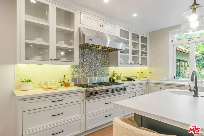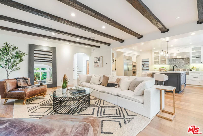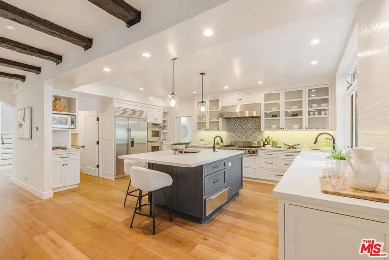 Experience timeless design and modern coastal living in this beautifully renovated Spanish-style estate located in the highly desirable Palisades Hills Estates. Thoughtfully renovated and beautifully appointed, this spacious home offers exceptional craftsmanship, seamless indoor-outdoor flow, and a detached guest studio, perfect for family, guests, or a private office. The elegant, vaulted entryway opens to a grand living room and formal dining area with dramatic beamed ceilings, and beautiful, modern, wood floors throughout the home. The heart of the home is an expansive great room that seamlessly connects to a gourmet chef's kitchen featuring top-tier stainless steel appliances, marble countertops, and a generous, walk-in butler's pantry. A 700+ bottle, temperature-controlled, wine room is ideal for storing those perfect bottles of wine for those special occasions. Multiple rooms open to the outdoors, creating a natural connection to the lush gardens and patio spaces. Upstairs, the primary suite is a serene retreat with a vaulted sitting room, private balcony, dual walk-in closets, and a spa-inspired bath with a luxurious, free-standing tub, steam shower, and dual vanities. Two additional ensuite bedrooms upstairs offer comfort and privacy. Additionally, there is separate, designated office on the main level which could act as an additional bedroom in the main house. The backyard is an entertainer's dream, complete with mature landscaping, fruit trees, garden paths, a built-in BBQ, Tuscan split rock pizza oven, a tranquil waterfall pond, and a romantic covered patio with fireplace. Residents of Palisades Hills Estates enjoy exclusive access to a private recreation club with pool, spa, tennis, pickleball, and basketball courts, offering a true resort-style lifestyle just minutes from the heart of Pacific Palisades.