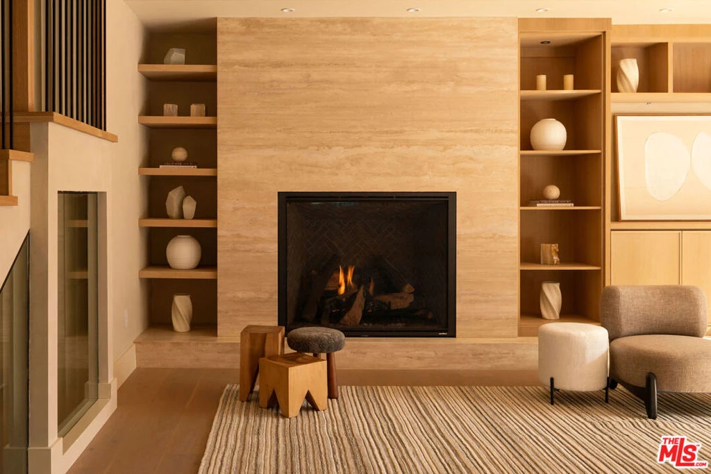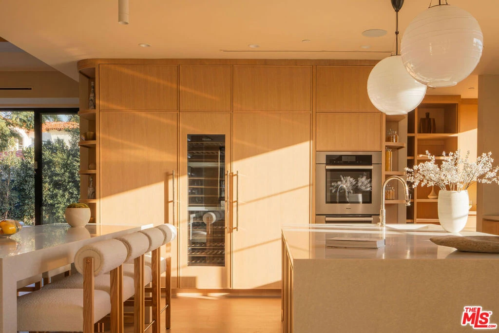 Set behind a composed masonry faade and framed by curated landscaping, this newly constructed contemporary residence pairs clean architectural lines with warm, textural finishes. Steel-framed openings and symmetrical design create a presence that feels both timeless and current. Inside, light-filled living spaces are defined by wide-plank oak floors, limewashed walls, and a refined blend of white oak and walnut millwork. Custom paneling, tailored built-ins, and sculptural lighting add depth while maintaining a cohesive, modern aesthetic. The main living room centers around a dramatic travertine fireplace with integrated shelving, while expansive openings flood the space with natural light. The layout flows seamlessly into the dining area and chef's kitchen, where white marble surfaces and slim Shaker-style cabinetry deliver both elegance and functionalityopen for entertaining yet comfortable for everyday living. Retractable sliding doors dissolve the line between indoors and out, extending the living space to a private, resort-like backyard. Mature hedging, layered greenery, and generous patio areas create multiple zones for dining and lounging, all surrounding a pool framed by clean hardscape and soft landscaping. Upstairs, the primary suite offers a calm, light-filled retreat. The spa-inspired bath features a freestanding soaking tub, expansive walk-in glass shower with bench, and a floating double vanity clad in rich wood with stone countertops and refined wall-mounted fixtures. Emperador Light marble and warm finishes add depth while maintaining a clean, contemporary feel. A custom dressing area with built-in shelving and tailored lighting completes the suite. Secondary bedrooms and baths continue the home's modern design language with consistent finishes and thoughtful detailing throughout. Resort-caliber amenities are thoughtfully positioned on the lower level, including a private cinema, a dedicated wellness suite featuring a fully outfitted fitness studio and spa bath with steam shower, as well as two additional guest suites. Outdoor entertaining areas extend the home's livability, creating a setting that functions as both retreat and gathering space. Meticulously executed, this contemporary residence blends architecture, comfort, and lifestyle with enduring appeal. Available furnished at $55,000 a month.