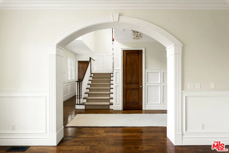 Situated on an untouched and preserved block in the Huntington, this prime corner lot boasts a distinguished New England Traditional that blends timeless charm with modern-day comfort. The home showcases exceptional craftsmanship, a thoughtful layout, and refined architectural details throughout. The main level features lofty ceilings, rich walnut floors, and expansive, light-filled living spaces, including formal living and dining rooms, a generous family room, private office, two powder rooms, dual staircases, and a temperature-controlled wine cellar. The modern chef's kitchen is equipped with a La Cornue range, Sub-Zero refrigeration, and an oversized center island, opening directly to the main living area. Upstairs, four secondary bedrooms complement a luxurious primary suite with vaulted ceilings, a fireplace, sunlit sitting room or office, private gym, dual walk-in closets, and a marble bath with double vanities. French doors open to a beautifully landscaped backyard with a trellis-covered patio, lush lawn, sparkling pool and spa, and built-in BBQ. Designed for both relaxation and entertaining, this exceptional outdoor setting completes a home that truly embodies timeless California living in one of the most desirable neighborhoods of the Pacific Palisades.