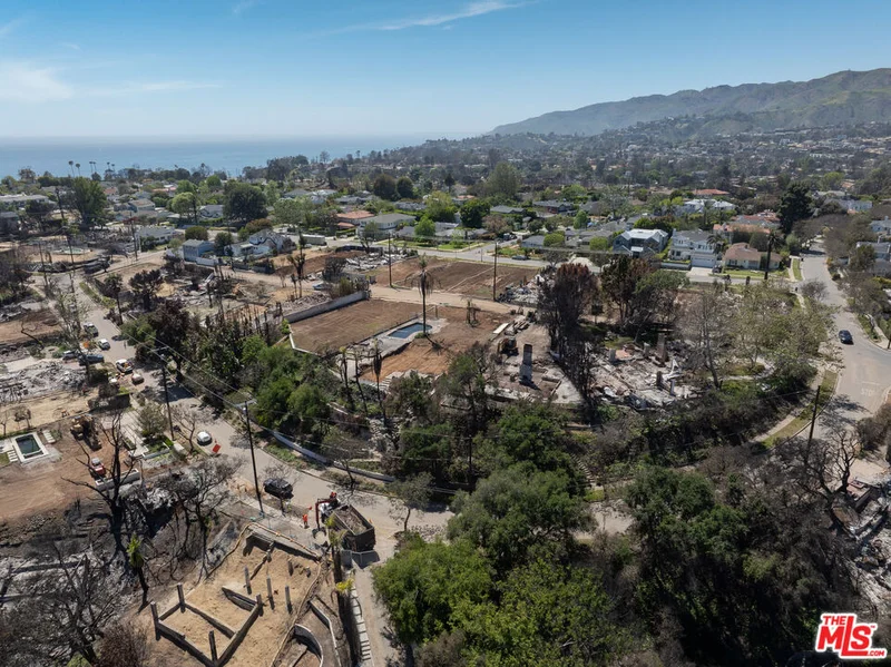One of the best lots on Erskine. Mostly flat with a finished hillside. This is a 13803 square foot lot with potential to build a beautiful home with ocean and canyon view. House was 3049 sf. Walking distance to the Palisades Village and the beach. The sellers of this property want the buyer to know that the family has been here since 1955 and put 70 years of love and care into the property, only to lose it in the Palisades Fire. The landscape in front with meandering walkways, waterfalls and ponds, was a labor of love weekend after weekend of this family working together over three generations to create what was a beautiful place. The seller is hopeful that whoever buys the property knows that this is a special place. The property has a level entrance on the Bowdoin Alley side where the previous house had two, two car garages with a small studio apartment besides them. At the front of the property on Erskine Dr. side, there is a large, permitted retaining wall halfway up the bank. Below the retaining wall there are terraced landscape walls for planting. To enter the property from Erskine Dr. you walk through a small wrought iron fence on to meandering concrete and stone walkway with an iron handrail following the path. The path has a pond and sitting area midway up that is fed by a manmade waterfall coming from an upper larger pond. The upper pond has a fountain with its own custom rock waterfall and flagstone deck. The water rapids travel underneath a custom arched foot bridge. There are great planting beds along the path and plenty of concrete seating for relaxation and meditation. Above the foot bridge is an interesting, custom brick and stone hardscape with great accents. The path ascends to a concrete patio overlook where you have a great view of Temescal canyon all the way to the ocean.