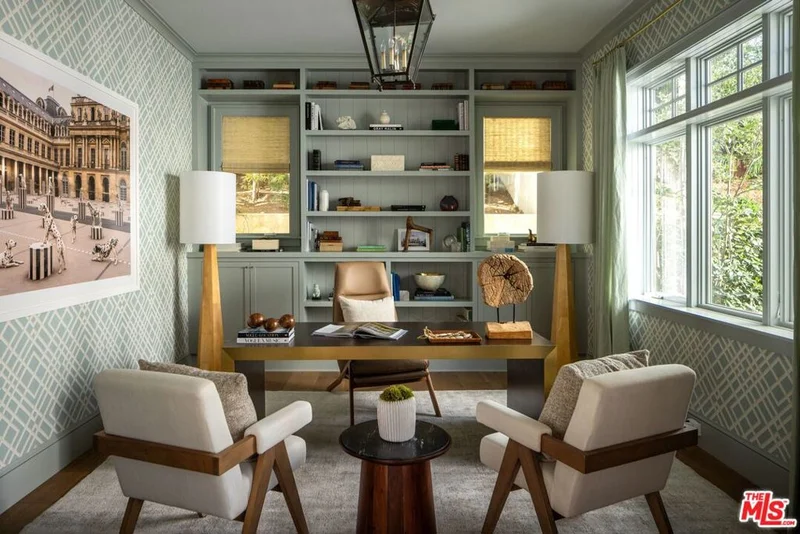 Designed by Gray Malin, renowned fine art photographer, this beautiful home exudes sophistication with a refined coastal elegance. Ideally located in Rustic Canyon, a prestigious enclave of the Pacific Palisades by the Pacific Ocean. The gated front courtyard features whimsical hedging, combining with mature trees and lush greenery for dramatic curb-appeal. Upon entry guests experience a double-height ceiling and voluminous rooms blending open-concept living with defined spaces. A formal entry, sitting room, office or den, and a refined dining room pivot around the stately oak spindle staircase. The living room with wood beamed ceiling, central fireplace and fully retractable wall of glass creates the optimal Southern California indoor-outdoor experience. The main level further includes a secondary dining area, top of the line chef's kitchen featuring Sub-Zero and Wolf appliances with custom cabinetry and large island, dual dishwashers, a walk-in pantry, butler pantry with wine fridge, an office area, secondary entrance/mudroom and half bath. The second level is graced by an oversized primary suite with vaulted ceilings, fireplace, walk-out patio overlooking the lush backyard and canyon views, double walk-in closets, a beverage area and resort-like spa bath with heated stone flooring, soaking tub and steam shower. Three guest rooms, a flex-space perfect for a family room, children's playroom, additional office or bedroom, three baths, and laundry complete the upper floor. At the lower level a generous family and entertainment room with state of the art movie screen, projector and surround sound, a secondary kitchenette/bar, a full home gym or bedroom and additional bathroom create the ultimate entertainment retreat. A beautiful mature oak tree defines the natural setting of the backyard with outdoor sitting areas with fire pit, a spa-pool with fountain, built-in bbq and alfresco dining area perfect for relaxation, play or entertaining guests. It offers the ultimate privacy with beautiful canyon views, a collage of greenery with citrus trees, hedges, a variety of flowers and raised garden boxes for harvesting farmed vegetables. The property features wide-plank floors and coastal designer details throughout with a 2-car garage, solar panels (with capacity to install Tesla Powerwall), EV charging, PuroServe home water filtration system and a storage room. With close proximity to nearby Rustic Canyon Park with tennis courts, top-rated Canyon & Palisades Charter Schools, and fine dining establishments Giorgio Baldi, Muse, the historic Golden Bull, Cafe Delfini, Rustic Coffee and Shore Bar. The home is matched for the most discerning clientele and can be purchased furnished, turn-key ready for occupancy. (Note: Photos 6,8,48 have been digitally altered to depict renderings of a larger pool and relocated firepit with lounge area. As per CA law, the original, unaltered image can be viewed next to the digitally altered image).