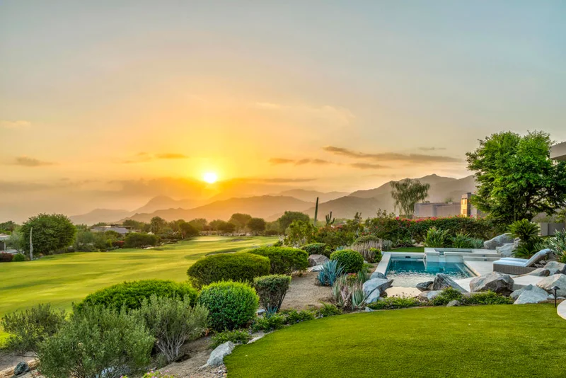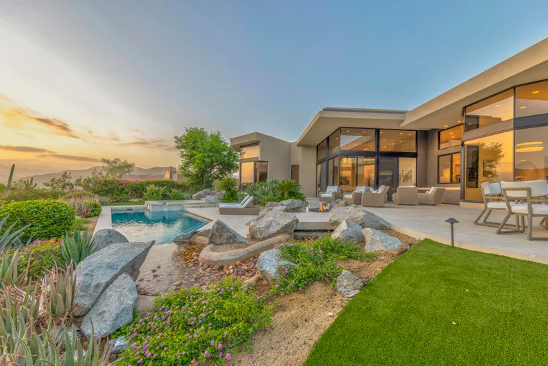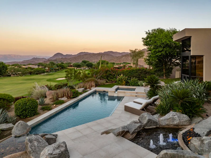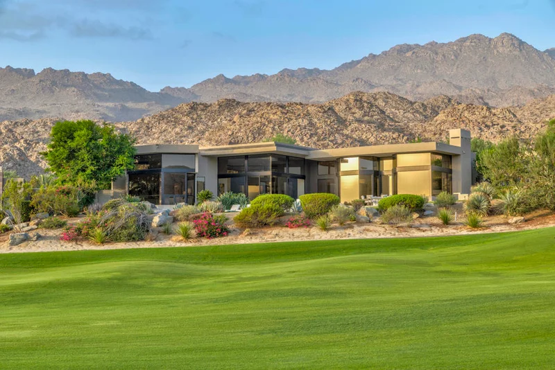An iconic Guy Dreier design completely transformed by Easton Builders with interiors by Fedderly & Associates. Located in the prestigious Bighorn Golf Club, one of the desert's most exclusive private clubs, this 5,400 sq ft home offers 4 bedrooms, 6 bathrooms, and commanding views of the 9th fairway, picturesque mountain ranges, and city lights from Bighorn's Mountains Course. The primary suite features a private office with courtyard views, luxurious master bath, and newly remodeled steam bath capturing breathtaking vistas. Two interior guest suites occupy the opposite wing, plus a separate-entrance guest house for ultimate privacy. Soaring ceilings, floor-to-ceiling glass, and seamless indoor-outdoor flow create stunning living spaces throughout. Multiple outdoor entertaining areas include a pool and spa, built-in BBQ, reimagined river water feature, and firepit perfect for sunset gatherings. Essentially a brand-new home with stunning cosmetic upgrades, it also features a new roof, completely new plumbing, electrical, HVAC systems, pool equipment. Offered fully furnished and move-in ready.