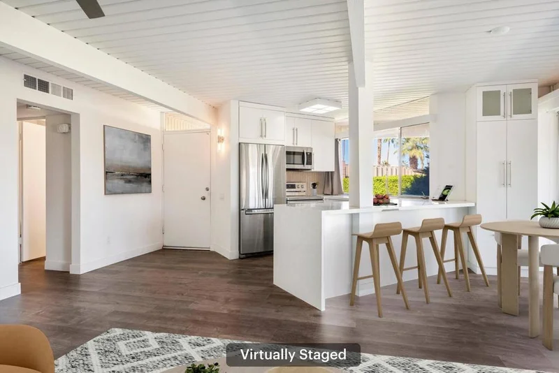 Welcome to Sandpiper, a wonderful community located in South Palm Desert, just minutes from world-renowned El Paseo, famous for its exceptional dining, shopping, and entertainment.The Sandpiper development, designed by renowned architect William Krisel, blends iconic mid-century architectural elements with modern style. This gated and enclosed community has been recognized as a historic site, offering both charm and architectural significance.This beautifully remodeled 2-bedroom, 2-bath condo is ideally situated with stunning mountain views. The pool is conveniently nearby while still providing a sense of privacy. The home features an open floor plan with signature concrete block walls, post and beam structure with tongue and groove ceilings, and floor-to-ceiling sliding glass doors that bring the beauty of the outdoors inside.The kitchen offers ample cabinet space, quartz countertops, stainless steel appliances, custom tile backsplash and island seating perfect for entertaining or casual dining.Both bedrooms are spacious and thoughtfully positioned for privacy. The primary suite features direct access to a private, enclosed patio along with generous closet space. The primary bathroom includes a nicely sized shower with quartz tone tile finishes. The guest bedroom has additional space making it perfect for an office area.The east-facing patio features beautiful stone tile and offers plenty of room for outdoor living, making it the perfect place to enjoy the morning sun while taking in the mountain views and nearby pool.Additional upgrades include laminate wood flooring and remodeled kitchen and bathrooms.Property is eligible for the Mills Act which can offer property tax savings. Plus HOA'S include internet, cable , water and trash making it a great value.A must-see property in one of Palm Desert's most architecturally significant communities. Please see that the property is virtually staged on photos.