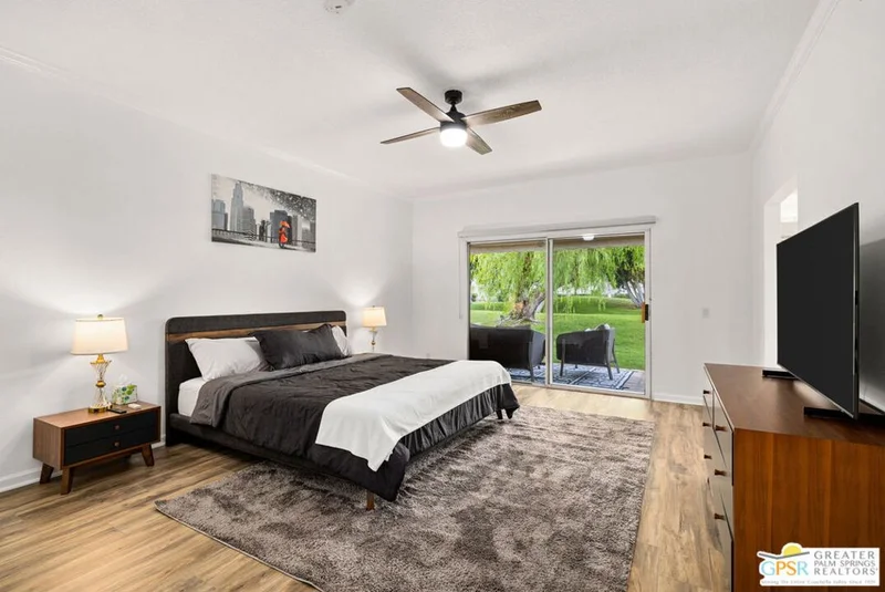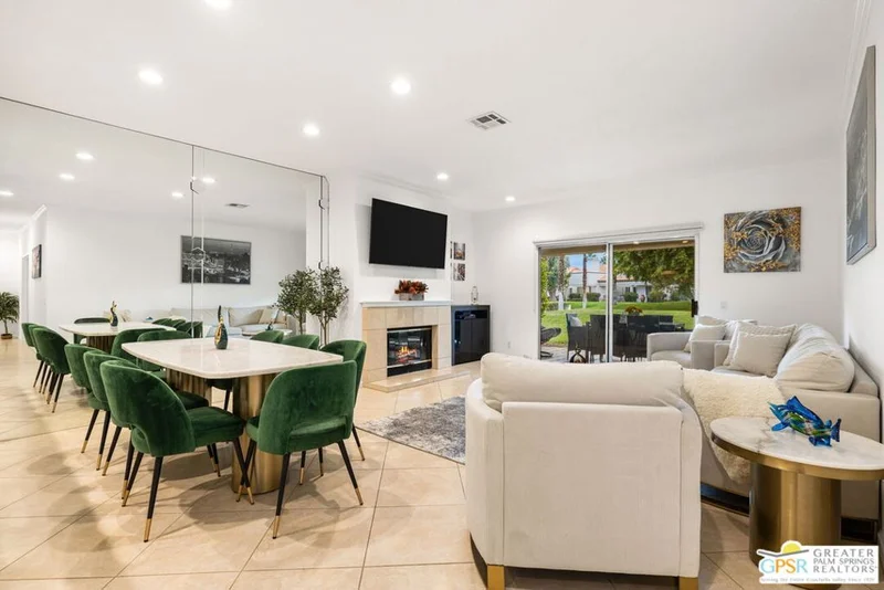 Escape to paradise in this lower-level, 3-bedroom, 2.5-bath condo with 1,814 sq. ft. of comfortable living space in the highly desirable Desert Falls Country Club. The updated kitchen features granite counters and a cozy breakfast nook, while the spacious living room offers a fireplace perfect for cool desert evenings. Tile flooring in the common areas and laminate in the bedrooms provide easy maintenance. The primary suite boasts a large bathroom with dual sinks, a soaking tub, walk-in shower, and a spacious walk-in closet. Step outside to the back patio equipped with a misting system and enjoy gorgeous pool views, creating the perfect setting for relaxation. Additional highlights include a 2-car garage with a large driveway for extra parking. The HOA covers cable, high-speed internet, and access to resort-style amenities such as golf, tennis, pickleball, a fitness center, and the clubhouse all without requiring a membership. Your guests and renters can also enjoy free access to these amenities. For added security, Desert Falls is a gated community patrolled 24/7 for peace of mind. This prime location is just minutes from El Paseo dining, Acrisure Arena for hockey games and live events, as well as the upcoming DSRT Surf wave pool, making it an even more attractive destination for vacationers. Whether you're seeking a second home, investment property, or a winter retreat, this stunning condo offers it all. Don't miss out on this exceptional opportunity!