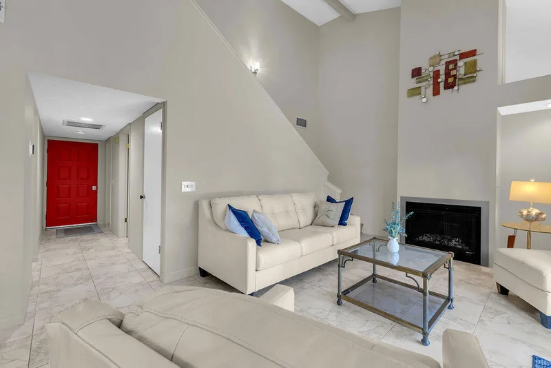 Tucked along a quiet lane in a premium Palm Desert location, this vibrant home blends comfort and style with tile flooring, updated fixtures, modern hardware, and custom built ins. The open living and dining area impresses with soaring two story ceilings, mirrored accents, and a sleek fireplace. Two sets of sliding glass doors frame stunning lake views, where swaying palms and lush greenery create a serene backdrop. Designed for flexibility, the home offers two primary suites--one conveniently located on the main level and another upstairs with a spacious walk in closet and generous bath. The large loft serves as an ideal family room or private retreat and includes a Murphy bed for visiting guests. Step outside to the fenced courtyard and enjoy sunny, unobstructed lake views--perfect for morning coffee or evening cocktails. Park Palms is a beautifully maintained gated community featuring park like grounds, meandering streams, shimmering lakes, a well appointed clubhouse, fitness center, pools, spas, and tennis and pickleball courts. Homeowners also enjoy a vibrant social calendar, with seasonal events and gatherings at the clubhouse that bring neighbors together and enhance the community's welcoming atmosphere. Its central location places you close to Desert Willow Golf Resort, El Paseo, the McCallum Theatre, and a wide array of shopping and dining. Monthly HOA fees include cable and high speed internet.