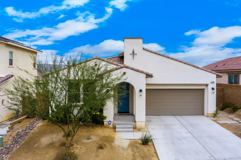 Welcome to Sage Palm Desert! Built in 2021 by Ponderosa Homes, this beautifully maintained single-story residence offers the benefits of newer construction without the wait. With the option of being fully furnished, this home provides a move in ready experience. The thoughtfully designed 3-bedroom floor plan showcases warm tones and modern finishes throughout. The open-concept living area flows seamlessly into a spacious kitchen featuring upgraded stainless steel appliances and a large island--ideal for both everyday living and entertaining. The large private primary suite features backyard views, dual vanity sinks, and a generous walk-in closet. Additional highlights include vinyl wood-look flooring, marble countertops in the kitchen and bathrooms, extended kitchen cabinetry, Milgard windows, new window coverings, and electric vehicle charging in the garage. Enjoy OWNED SOLAR for energy efficiency and low electric costs, along with a smart home system and wired alarm. Peek-a-boo mountain views from the main living area and patio elevate the living space. The backyard is designed for year-round enjoyment with a wraparound covered patio, ceiling fans, and low-maintenance landscaping. Sage Palm Desert is a gated community featuring a completed resort-style clubhouse with a pool, spa, and fitness center, offering a true desert lifestyle. Seller is willing to sell the home furnished or unfurnished making it a great second home or investment opportunity!