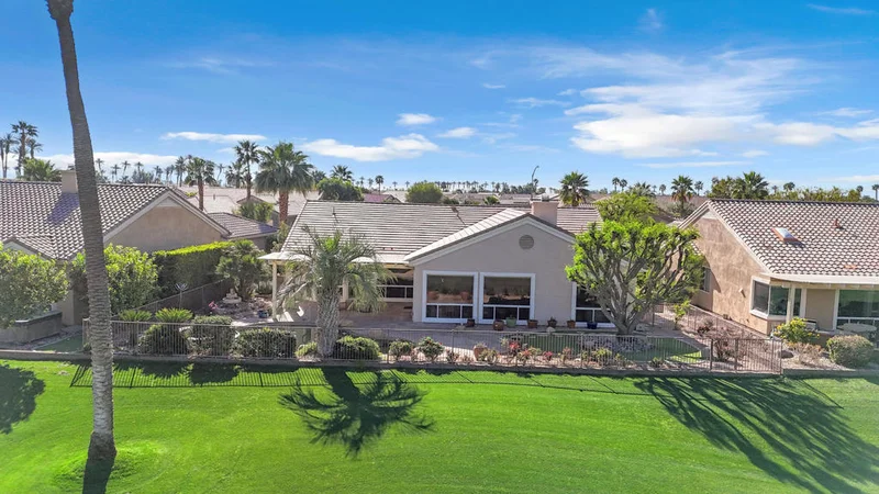 Lowest-priced San Remo floor plan in the desirable 55+ community of Sun City Palm Desert! Perfectly positioned on the bend of the 6th fairway, this home offers sweeping golf course and mountain views that can be enjoyed from nearly every room.The backyard is designed for resort-style living with a PebbleTec pool and spa accented with flagstone, an extended salt-finished patio, misting system, and lush low-maintenance landscaping with artificial turf--perfect for relaxing or entertaining while taking in the stunning views.Inside, the home features a dramatic 14-foot vaulted ceiling in the living and dining room, creating a bright and open feel. The family room showcases hardwood flooring, a custom built-in media center, and a tile-trimmed gas fireplace for cozy evenings.The kitchen is well appointed with upgraded cabinetry, slab granite countertops, stainless steel appliances, a breakfast bar, and stylish pendant lighting.The spacious primary suite includes a huge walk-in closet with built-in storage. The primary bathroom offers dual sinks, a glass-enclosed stall shower, and an oversized soaking tub.On the opposite side of the home is a private guest wing with two bedrooms and a bathroom. One bedroom is currently configured as an office with custom built-in desk and shelving. The guest bath features tile surfaces and a shower/tub combination.Additional features include a laundry room with utility sink and built-in storage and a 2+ golf cart garage with built-in cabinetry.A fantastic opportunity to own a golf course home with incredible views and resort-style outdoor living in Sun City Palm Desert.