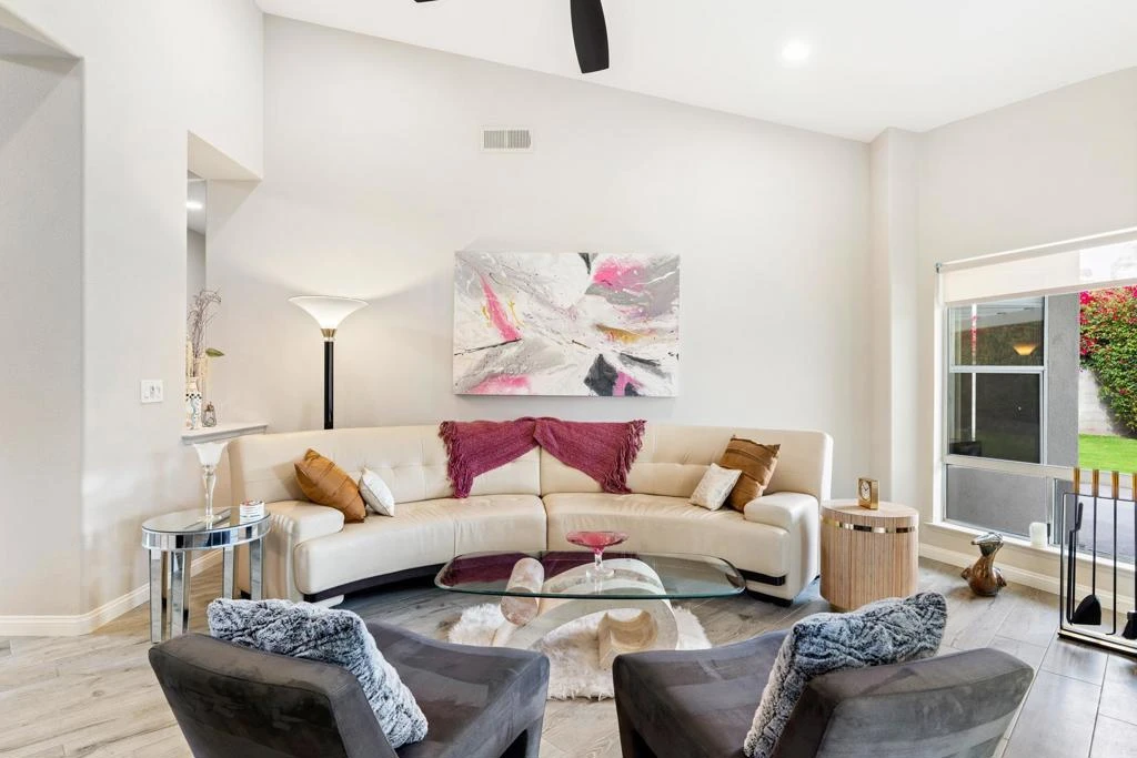 Best Priced Upgraded Home in Whitehawk! Fully renovated and move-in ready, this stunning 3-bedroom, 2.5-bath residence offers the perfect blend of modern design, comfort, and value within a quiet, gated enclave in the heart of Palm Desert.Step inside to find a beautifully upgraded interior featuring quartz countertops, sleek porcelain flooring, stainless steel appliances, recessed lighting, and freshly painted walls throughout. Designed for both relaxation and entertaining, the home also includes a private, covered patio--ideal for enjoying the desert lifestyle.The garage is a standout feature for car enthusiasts, complete with epoxy flooring and its own mini-split A/C system. Additional highlights include golf cart access to a nearby course, with optional membership opportunities at Woodhaven.The HOA offers exceptional value, covering a premium Spectrum package, trash service, and maintenance of the common grounds and gated entry.Fully upgraded and competitively priced, this is the best value opportunity in Whitehawk for buyers seeking modern finishes without the added maintenance and cost of larger homes.