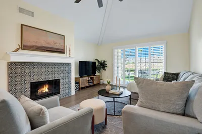 Updated Upstairs Condo in Desert Breezes | Prime Palm Desert Location. Welcome to this beautifully updated upstairs residence in the highly desirable Desert Breezes community in Palm Desert. Offering two bedrooms and two bathrooms, this light-filled condo provides comfort, privacy, and a functional open layout ideal for full-time living, a seasonal retreat, or investment.The home was thoughtfully renovated just two years ago, featuring updated flooring, a beautifully remodeled kitchen and bathrooms with quartz countertops, updated electrical wiring, an upgraded A/C system and water heater--offering modern style along with long-term peace of mind. The spacious living area showcases a cozy gas fireplace and direct access to a private patio, creating a seamless indoor-outdoor flow ideal for both relaxing and entertaining. Plantation shutters and tasteful window coverings throughout add a refined, timeless touch.The upgraded kitchen showcases quality cabinetry, Quartz countertops, stainless steel appliances, and bar seating that opens to the dining and living areas--perfect for everyday living or entertaining. An indoor laundry closet with washer and dryer adds convenience.Located across from the Indian Wells Tennis Garden, home of the BNP Paribas Open, this Palm Desert property enjoys an exceptional location near shopping, dining, recreation and world-class golf.Residents of Desert Breezes enjoy resort-style amenities including pools and spas, tennis and pickleball courts, a fitness center, and clubhouse. HOA dues include internet, cable, Wi-Fi, water, and trash service--making ownership both simple and convenient.This upstairs home is a wonderful opportunity to enjoy all that Desert Breezes and Palm Desert have to offer.
