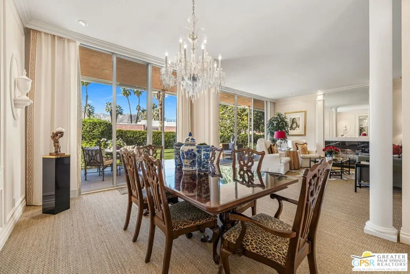 A rare Hollywood Regency restoration behind the gates of Marrakesh Country Club, this turnkey furnished 2 bedroom, 2 bathroom residence is a museum-quality tribute to the original vision of architect John Elgin Woolf thoughtfully elevated for modern desert living. With a privatized west-facing yard and exceptional indoor-outdoor flow, this premier offering stands apart as one of the finest restorations to come to market within this architecturally significant community. A comprehensive restoration was completed in 2024, followed by a fully reimagined kitchen finalized in January 2026, along with freshly painted interiors and new seagrass carpeting. Every decision was guided by extensive research into Woolf's architectural philosophy, with inspiration drawn from his legendary Woodland estate in Beverly Hills - once home to producer Robert Evans. Authentic period elements were meticulously recreated by skilled artisans, including panel and crown mouldings, pilasters, fluted trims, columns, oval window, door crowns, mirrors, urn accents, and Woolf's signature mock "invisible flue" fireplaceall executed with exceptional craftsmanship and finishes. Arrival is cinematic. A gated front courtyard with fountain, rose garden, and generous entertaining space sets the tone before iconic Pullman double doors open to interiors featuring 10-foot ceilings, expansive sliders, Austrian crystal chandeliers, custom moulding treatments, designer and art lighting, and dramatic black and opal marble surfaces. The restored kitchen offers quartz countertops, a Wolf range with ventilation hood, and mountain views, blending period integrity with modern function. Bathrooms feature restored cabinetry, marble counters, and polished nickel fixtures. Both bedrooms are generous in scale and function as primary suites with one enhanced by a retreat-style sitting area and each offering expansive closet space. The residence is ideally positioned on an exceptionally sited lot with a rare large side lawn, inner atrium garden, and an almost private rear garden and patio framed by mountain views, citrus trees, and beautifully maintained HOA grounds. Electric vehicle charging capability is available in the garage. Offered turnkey furnished per inventory for an effortless, immediate move-in experience, this is a truly exceptional opportunity where architectural integrity, refined design, and relaxed desert living converge within one of the Coachella Valley's most celebrated architectural communities.
