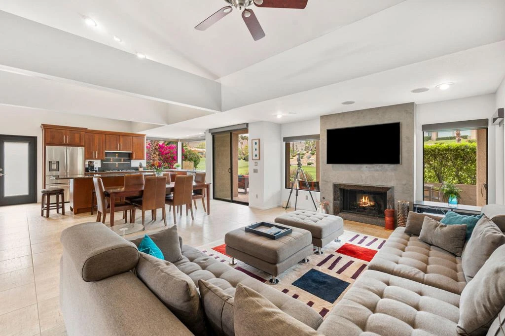 Perfectly situated within the prestigious Ironwood Country Club, this free-standing Skyview Villa offers breathtaking mountain views and an ideal blend of luxury, comfort, and modern living. Thoughtfully remodeled and expanded, the home now features a dedicated interior laundry room and a walk-in pantry, seamlessly opening to a spacious Great Room designed for both everyday living and effortless entertaining.The beautifully appointed kitchen is highlighted by sleek granite countertops, stainless steel appliances, and expansive corner picture windows that beautifully frame the surrounding mountain scenery. The home includes three bedrooms, each offering comfort and flexibility, along with three well-appointed bathrooms.Recent upgrades include a newer NexGen furnace and A/C condenser with a 5-foot-deep HEPA filtration system, a Samsung refrigerator, and a new washer and dryer - offering peace of mind and modern efficiency.Outdoor living is equally impressive, featuring a large main patio with two fire pits, perfect for evening gatherings, as well as a side patio complete with a BBQ area and partial cover for year-round enjoyment.Offered turnkey furnished, this move-in-ready residence is an exceptional opportunity to enjoy desert living at its finest.