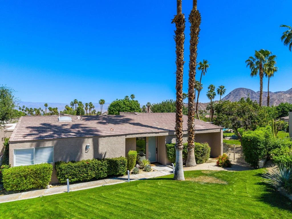 Absolutely gorgeous villa, charming in every way, with stunning, full-on views of the desert's iconic Mt. Eisenhower from inside and out. Perched on an elevated lot, this beautifully upgraded 2BR/2BA condo is filled with natural light, soothing wall colors, and sophisticated designer touches - offering a perfect blend of comfort, style, and resort-like living. High vaulted ceilings create a sense of spaciousness and room volume throughout. The kitchen is efficiently laid-out, and comes complete with slab granite countertops, stainless appliances, and plenty of storage. Both bedrooms are very well separated for complete privacy and each is equipped with its own ensuite bathroom and walk-in closets. Both bathrooms offer dual sinks, large walk-in showers, and skylights. Ceramic plank flooring in the common areas and carpeted bedrooms. Additional upgrades include a large added floor-to-ceiling view window, dual pane sliders, expanded 384sf tile patio (with hard-wired radiant heater for winter nights), and an enclosed 2-car garage. Large pool and spa are just steps away - but far enough for privacy. Enjoy coffee in the morning or cocktails after golf on the super-relaxing rear patio while taking in the breathtaking mountain scenery. Whether you're seeking a full-time residence, seasonal getaway, or investment opportunity, this condo with its stunning views, stylish finishes, and unbeatable setting delivers on every level. Ironwood CC is an upscale and diverse community featuring two 18-hole championship golf courses, a recently renovated beautiful clubhouse, state-of-the-art fitness center, tennis, pickleball, and year round dining and social events. Just a golf cart ride to El Paseo with its high-end shopping, dining, galleries, luxury shops, grocery and services. Minutes to College of the Desert, McCallum Theater, and Palm Springs Int'l. Don't miss this one!