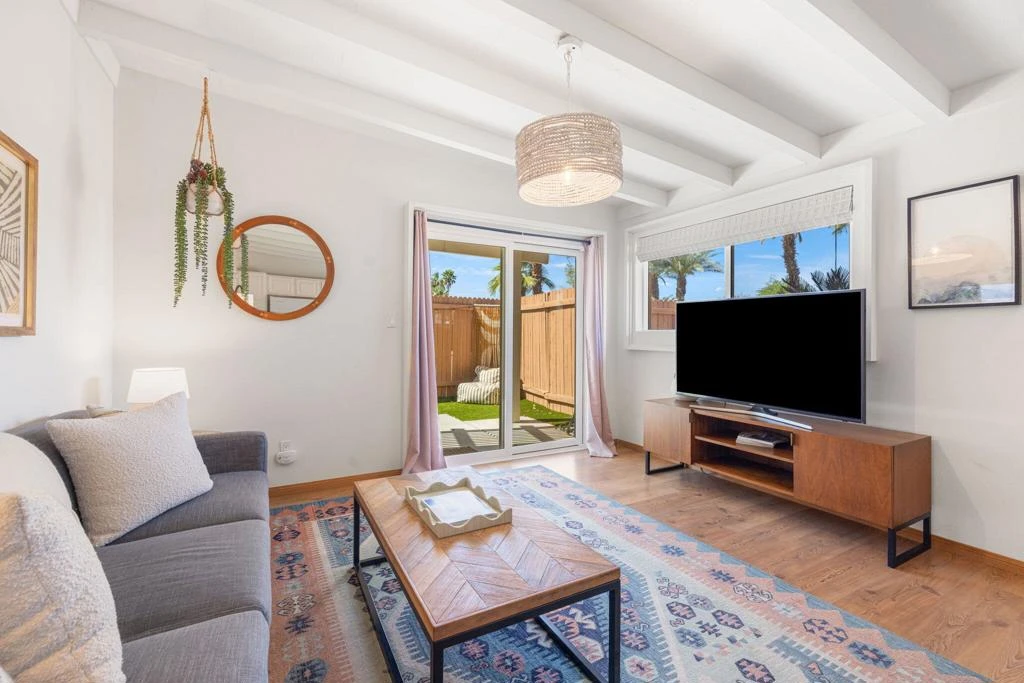 Chukker Inn- a mid-century community comprised of 11 units. Perfectly situated just behind El Paseo, this beautifully updated corner unit offers the ultimate in desert living with premier shopping and dining just a block away. Offered turnkey furnished with stylish pieces from Crate & Barrel and West Elm, this home is move-in ready and designed for comfort and sophistication. Notable upgrades include new windows and sliders, freshly painted interior, updated fixtures, and a newer microwave and range. The functional layout features an interior laundry unit for added convenience. Enjoy outdoor living on your private patio, complete with turf, concrete, and an alumawood awning--perfect for relaxing or entertaining while taking in serene mountain views. As a desirable corner unit, it offers added privacy and natural light. Located in a quaint community with low HOA dues and a beautiful pool, this property is ideal as a full-time residence, vacation home, or investment opportunity.