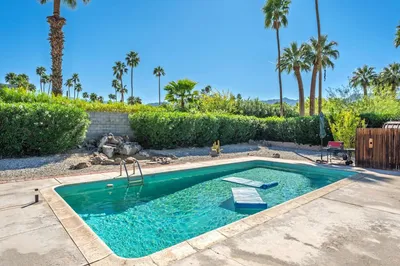 Welcome to the highly sought-after neighborhood of Silver Spur Ranch in South Palm Desert. This mid- century two- bedroom, two-bath home offers approximately 1500 square feet of living space and sits on a spacious lot with a desirable south-facing backyard.Inside you'll find a home full of character with original finishes and a spacious open floor plan. The living room is centered around a charming brick-accented fireplace and complemented by large windows that flood the space with natural light. Both bedrooms are generously sized, with one offering convenient access to the front yard and the other providing direct access to the backyard ideal for enjoying indoor-outdoor desert living.The kitchen features a functional layout with some updated appliances and seamless access to the backyard, making it perfect for entertaining. Step outside to experience desert living at its finest. The backyard is highlighted by a large pool with decorative rock waterfall, mature landscaping, and beautiful views. A covered patio provides the perfect setting for relaxing or hosting gatherings while enjoying the warm desert sunshine. The location is a true highlight of this home, ideally situated near Ironwood Park, the renowned Living Desert Zoo and Gardens, and the world-famous El Paseo Shopping District. Enjoy convenient access to premier shopping, dining and outdoor recreation- all just minutes away. This home presents a fantastic opportunity to add your own personal touches and create the ultimate desert retreat.